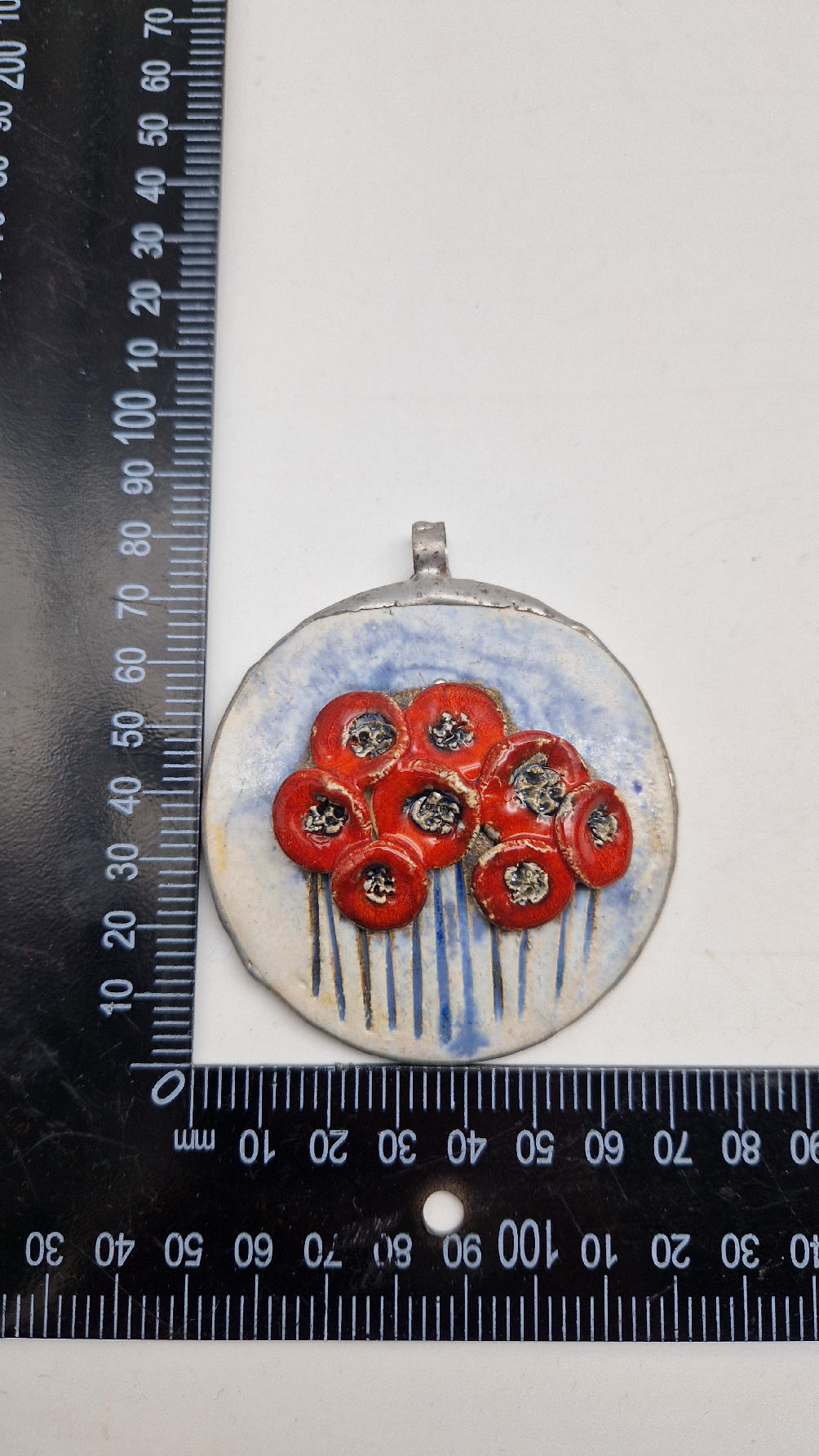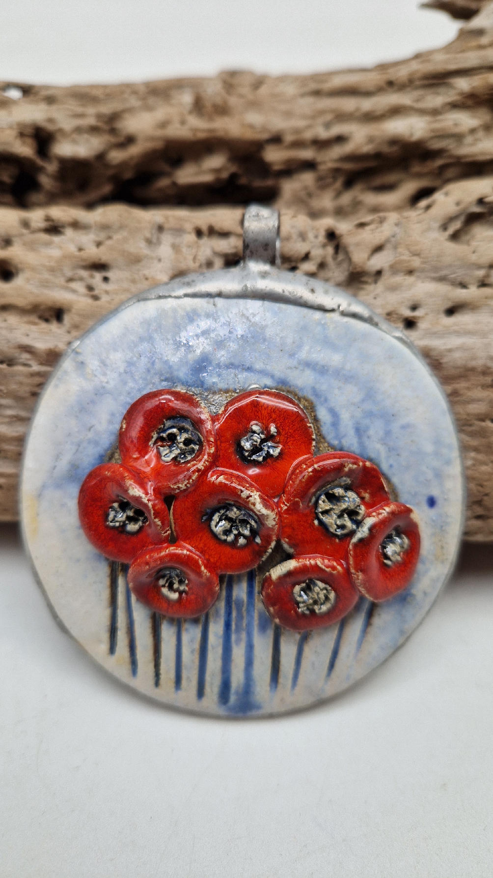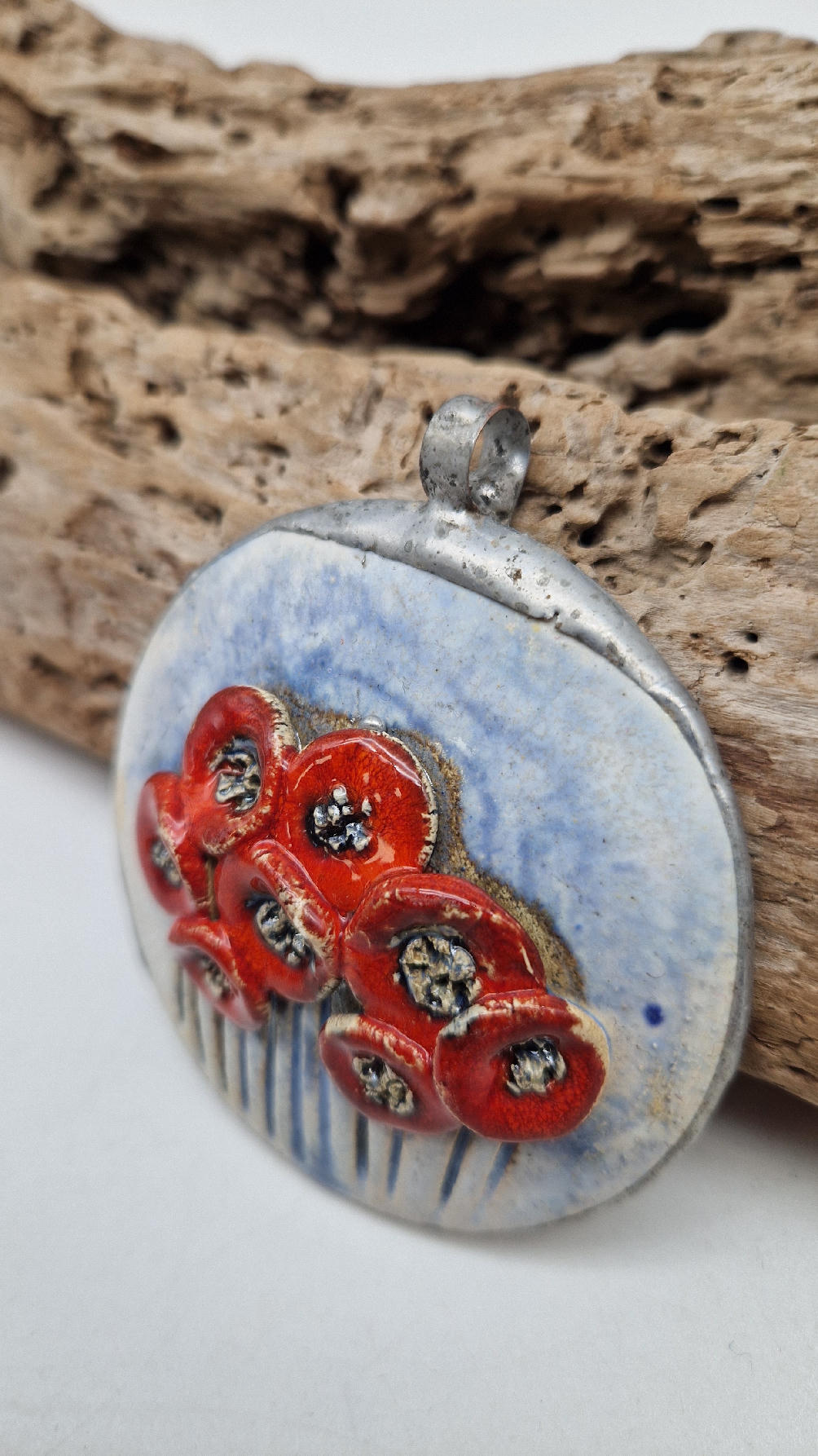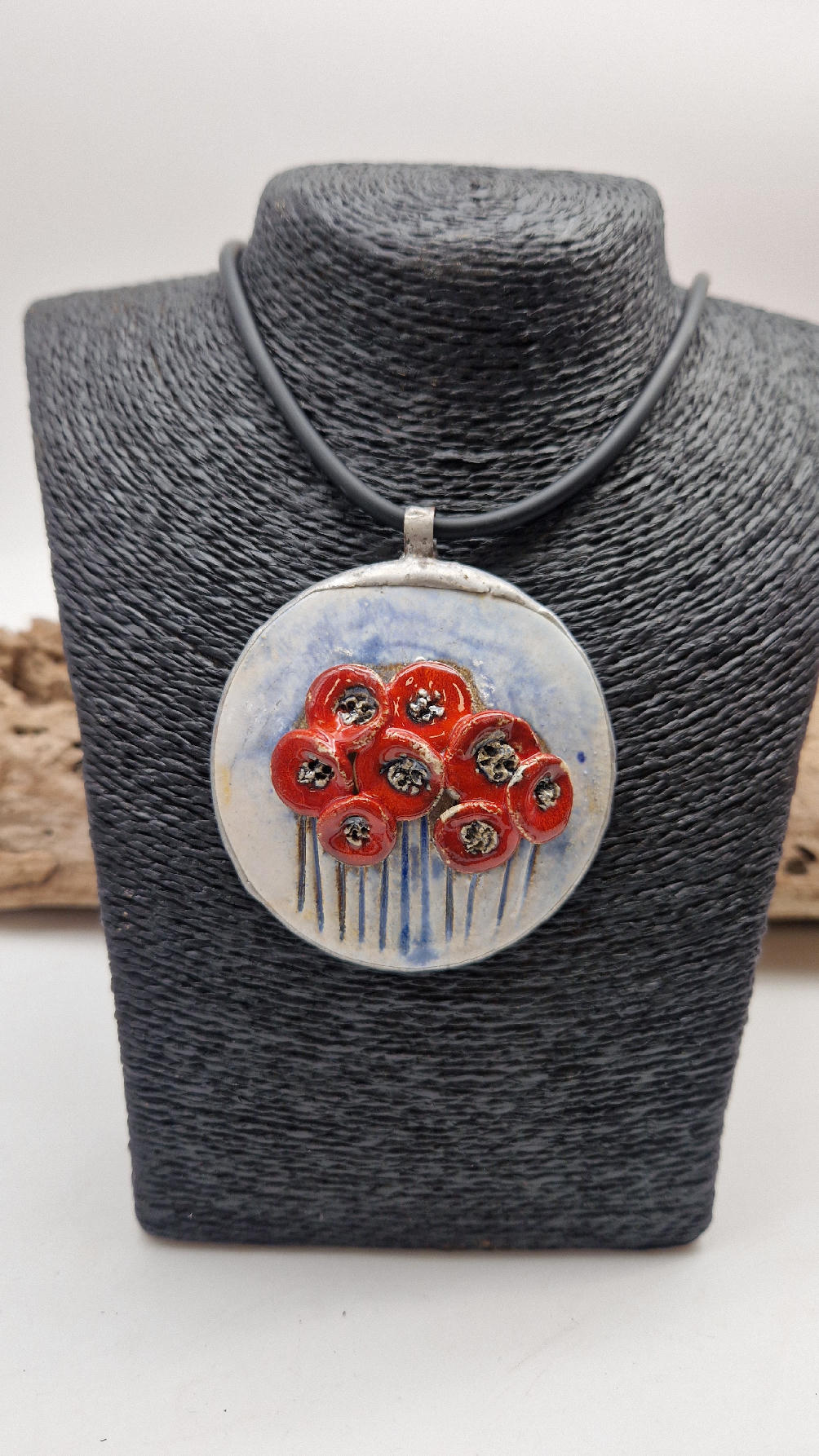 Śliczny ceramiczny, duży wisior zawieszony na kauczukowym rzemieniu.  Kwiaty, ale takie niewiędnące i śliczne ,które będą cieszyć oczy niezmiennie przez długi czas..