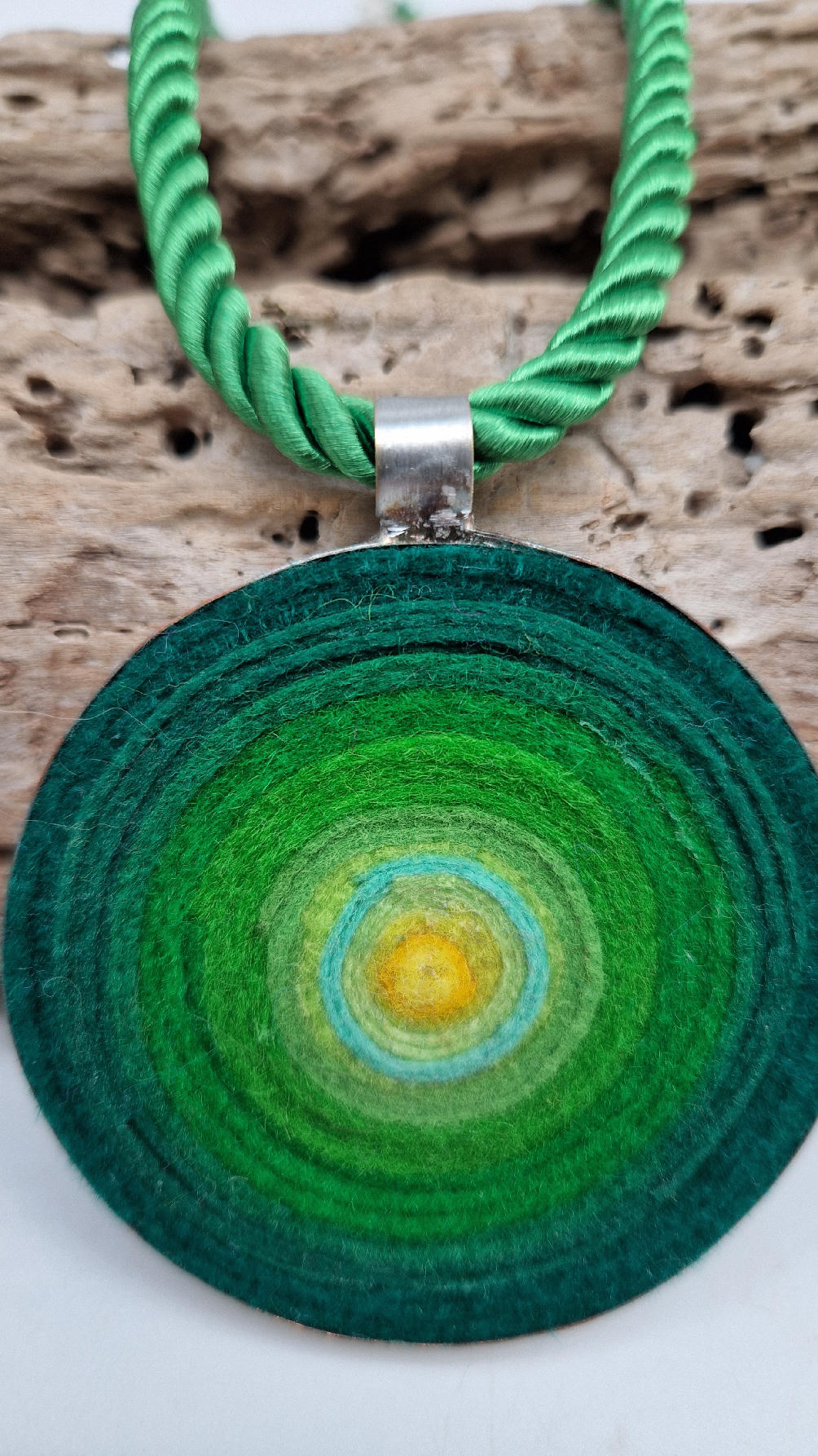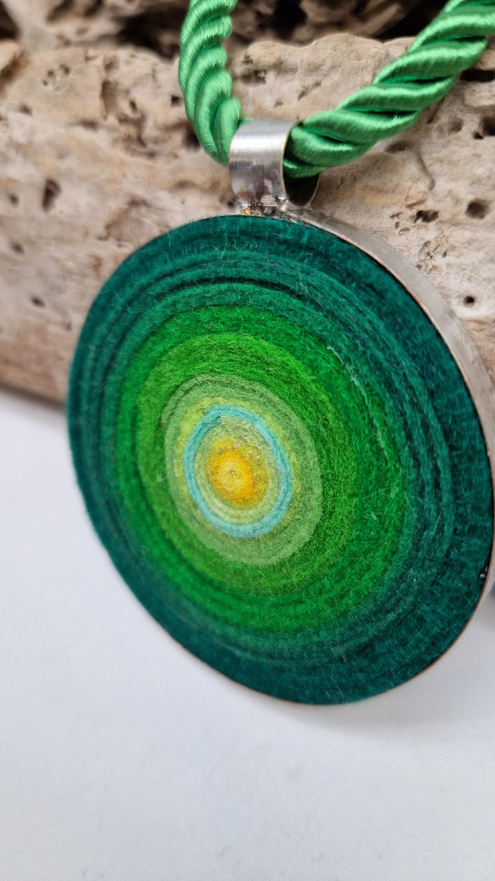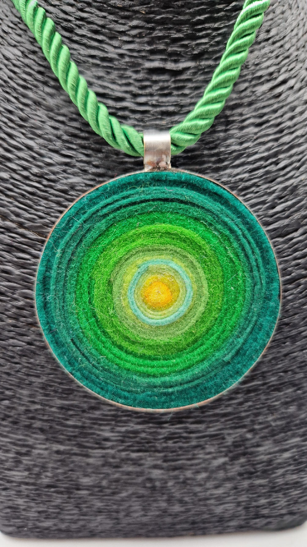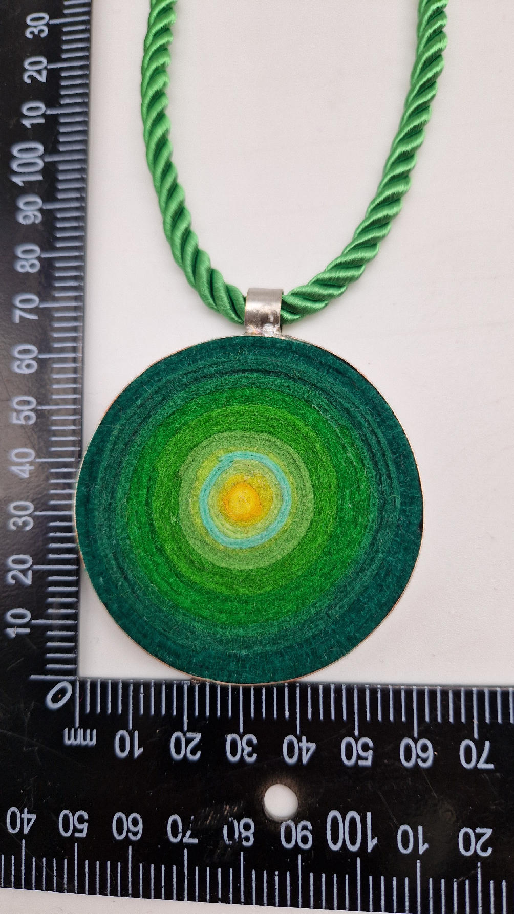 Nieduży, ale megaenergetyczny zielony wisior…metalowy, z kolorowym filcem w środku…okrągły, prosty, niebanalny, ponadczasowy, pięknie wykończony zrobiony z miedzi, kuty, patynowany, srebrzony, idealny…