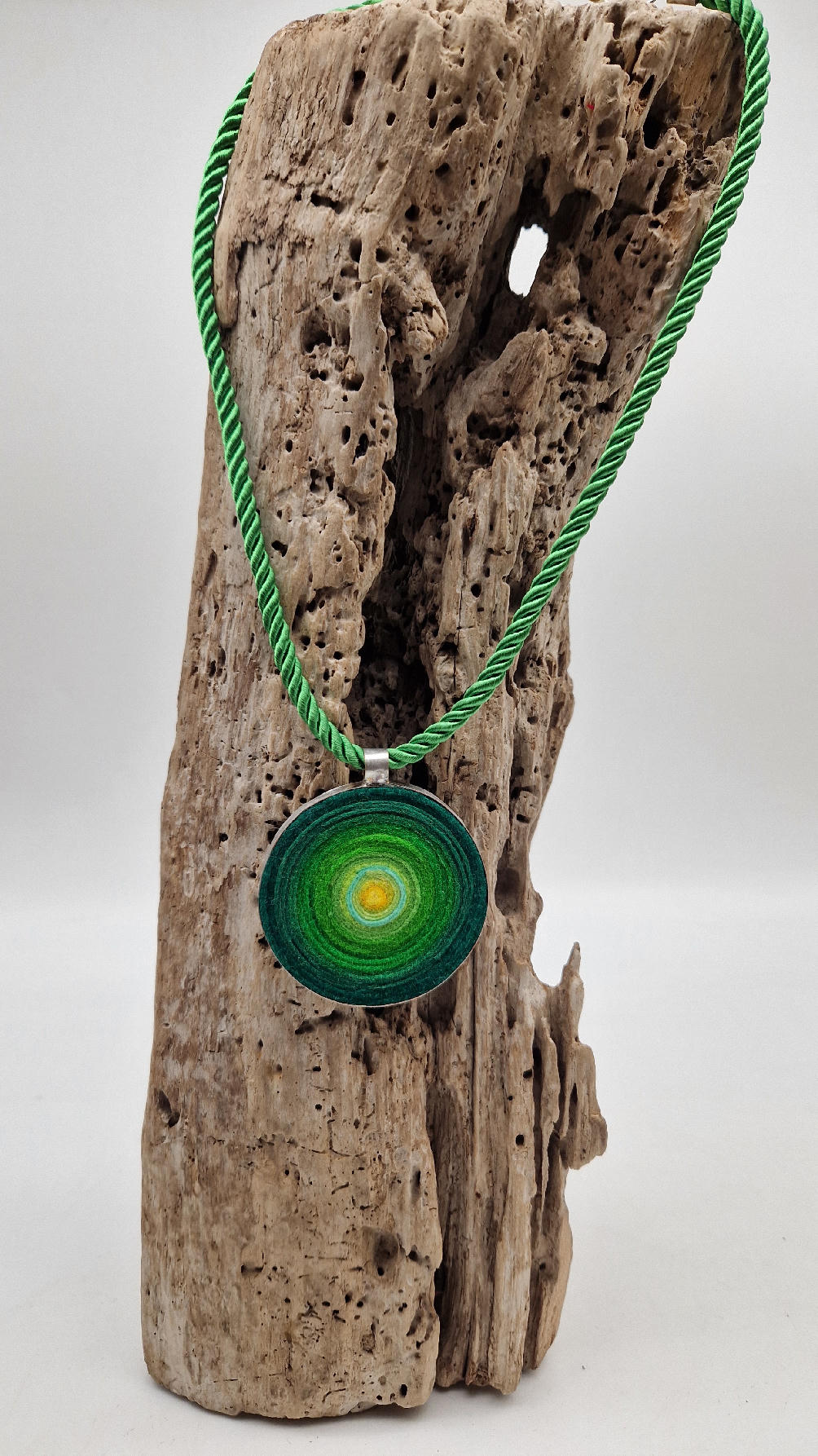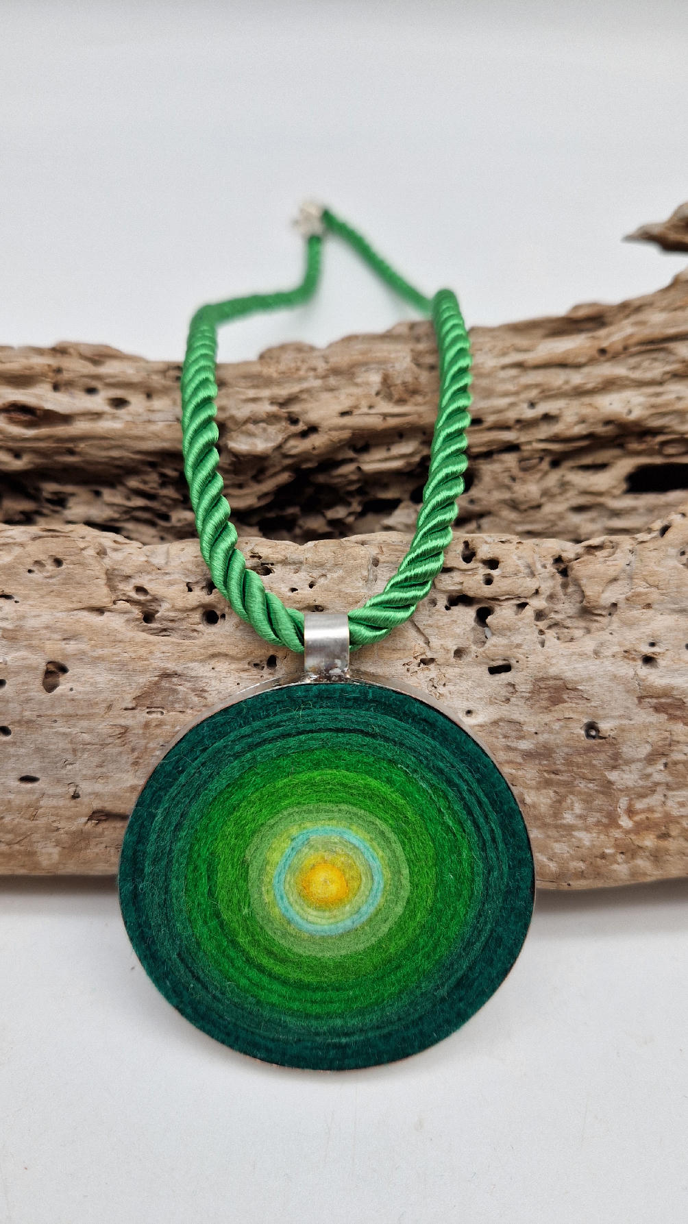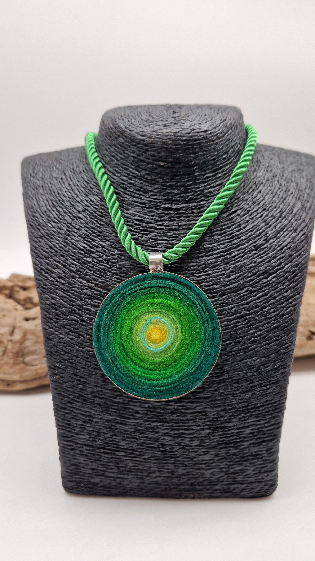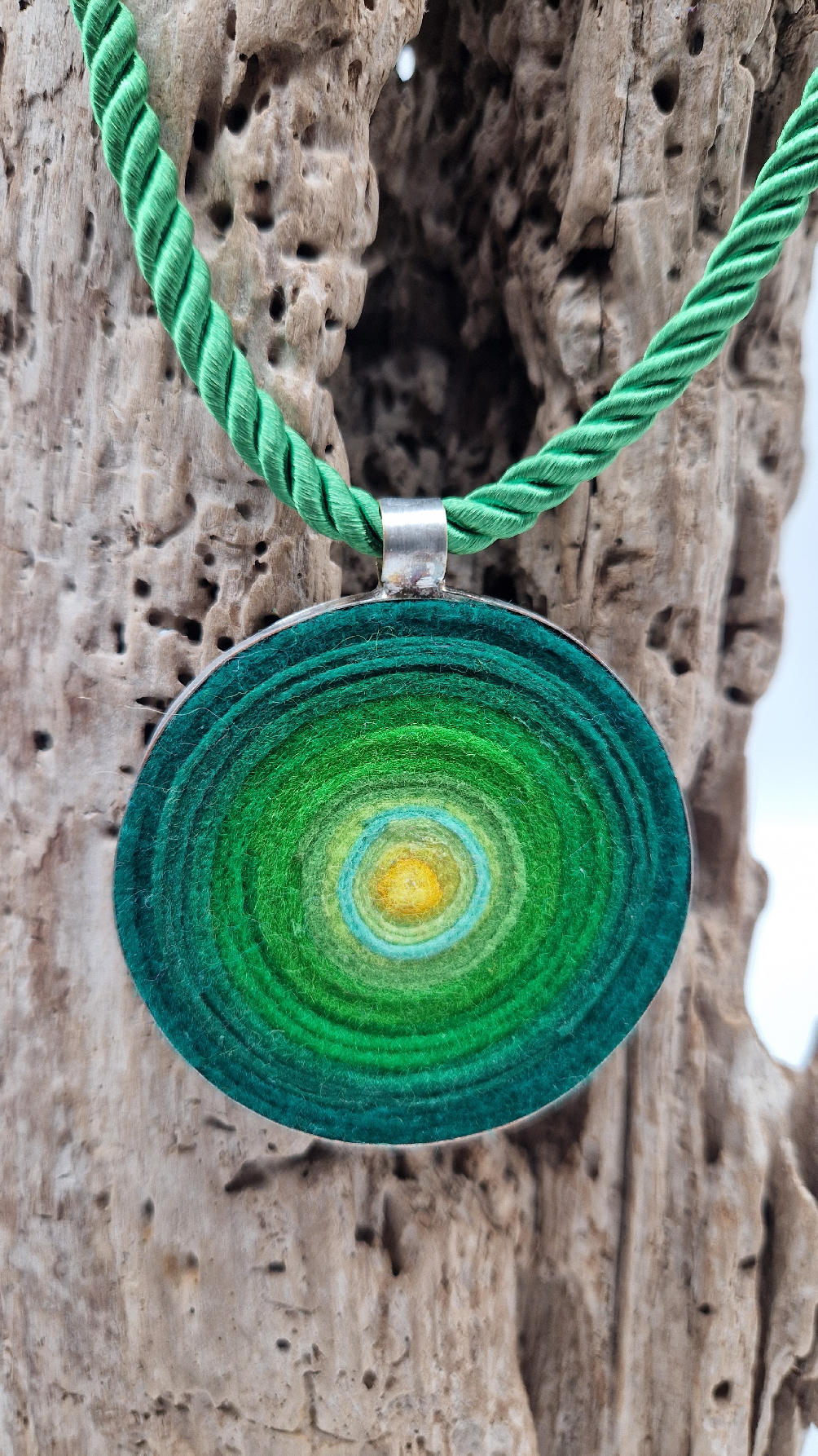 Nieduży, ale megaenergetyczny zielony wisior…metalowy, z kolorowym filcem w środku…okrągły, prosty, niebanalny, ponadczasowy, pięknie wykończony zrobiony z miedzi, kuty, patynowany, srebrzony, idealny…