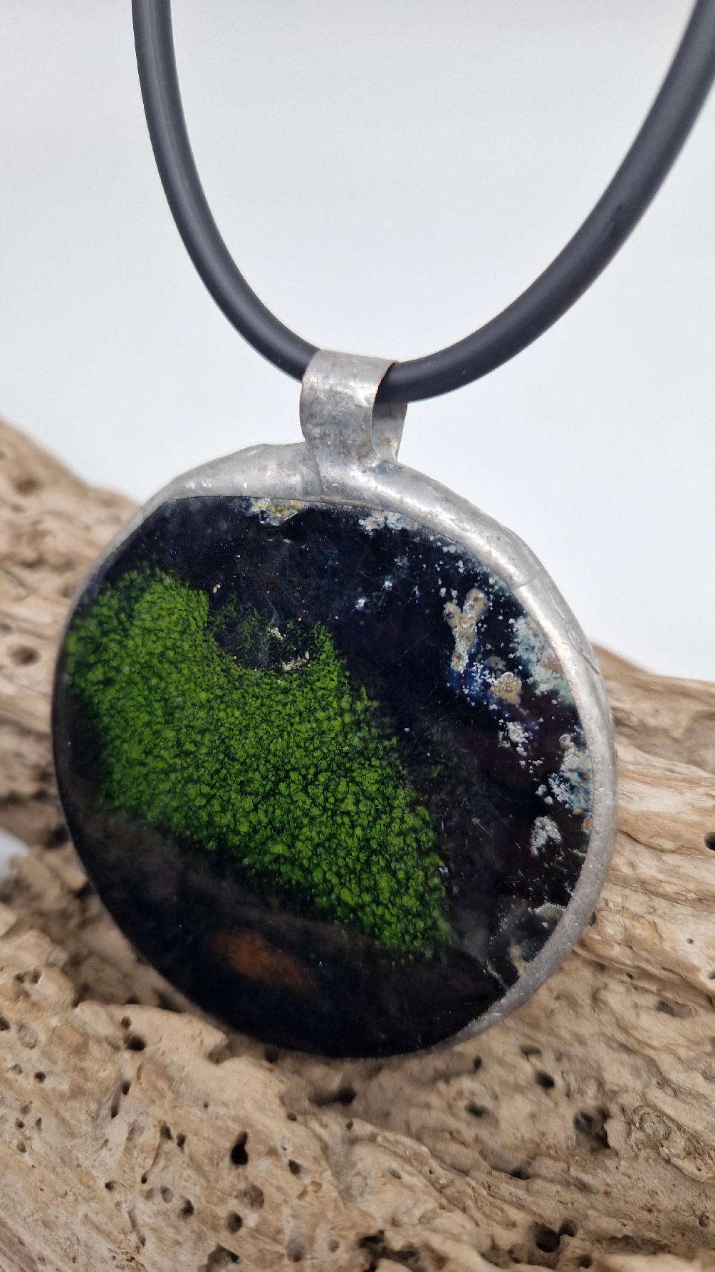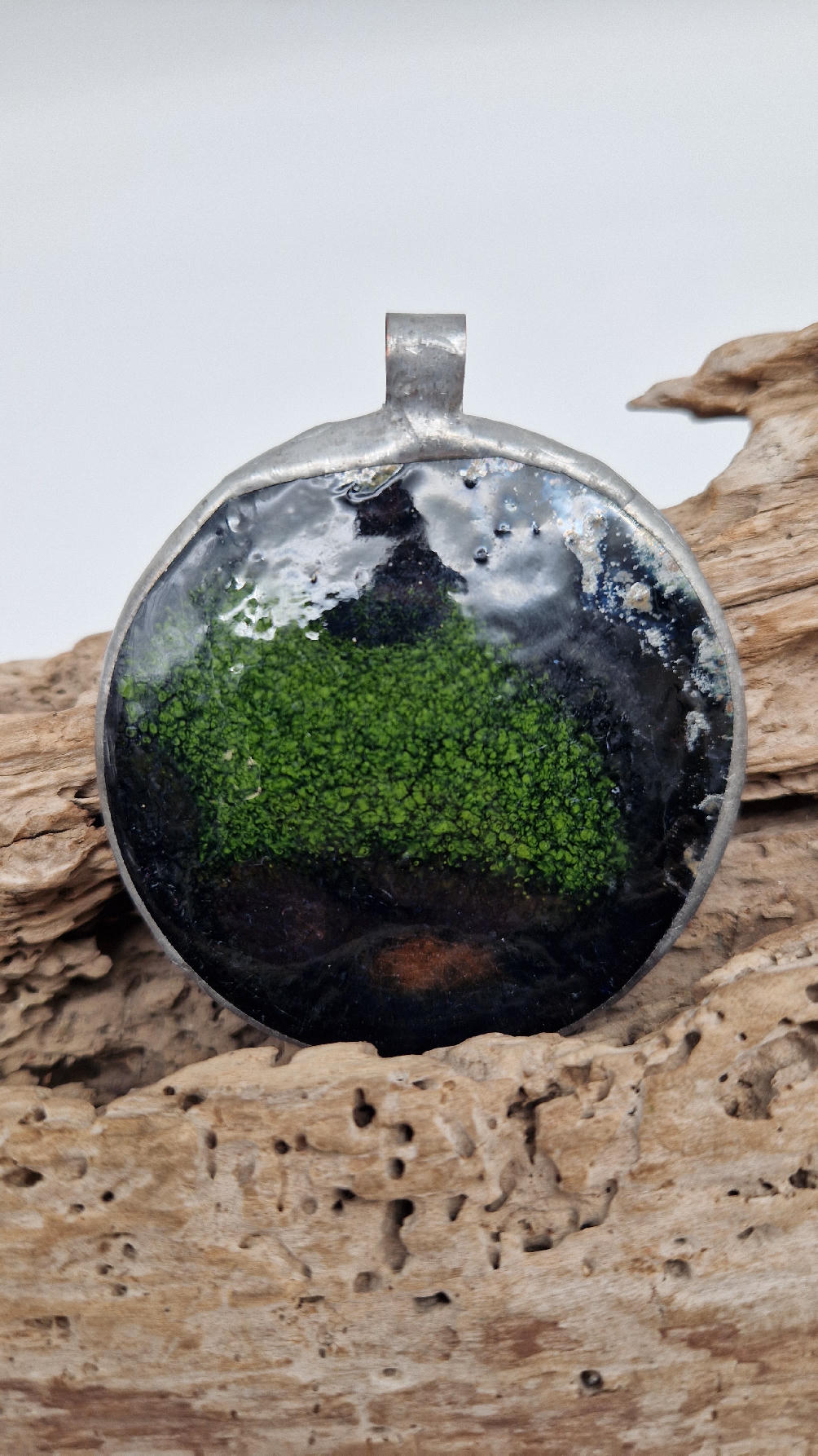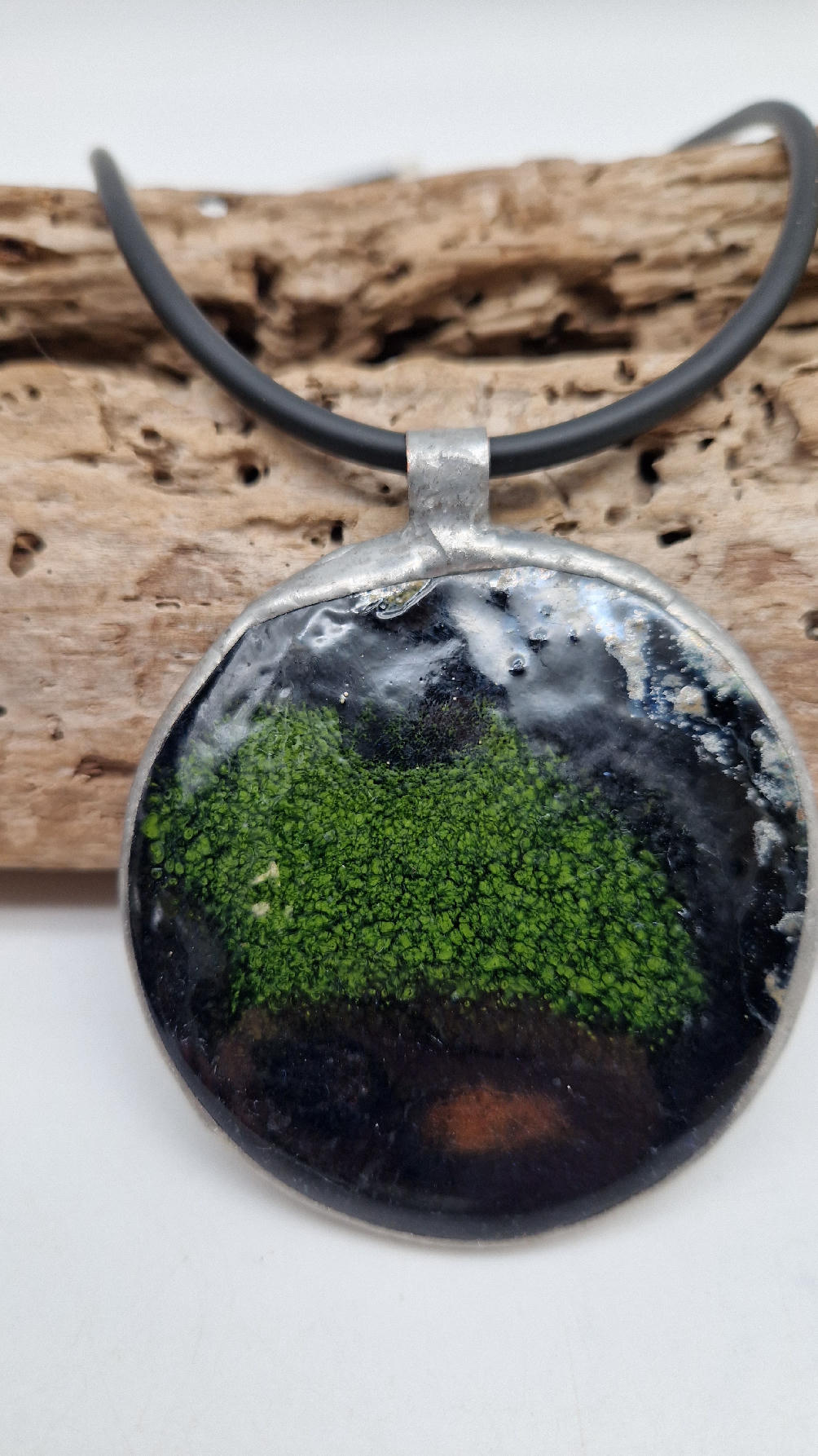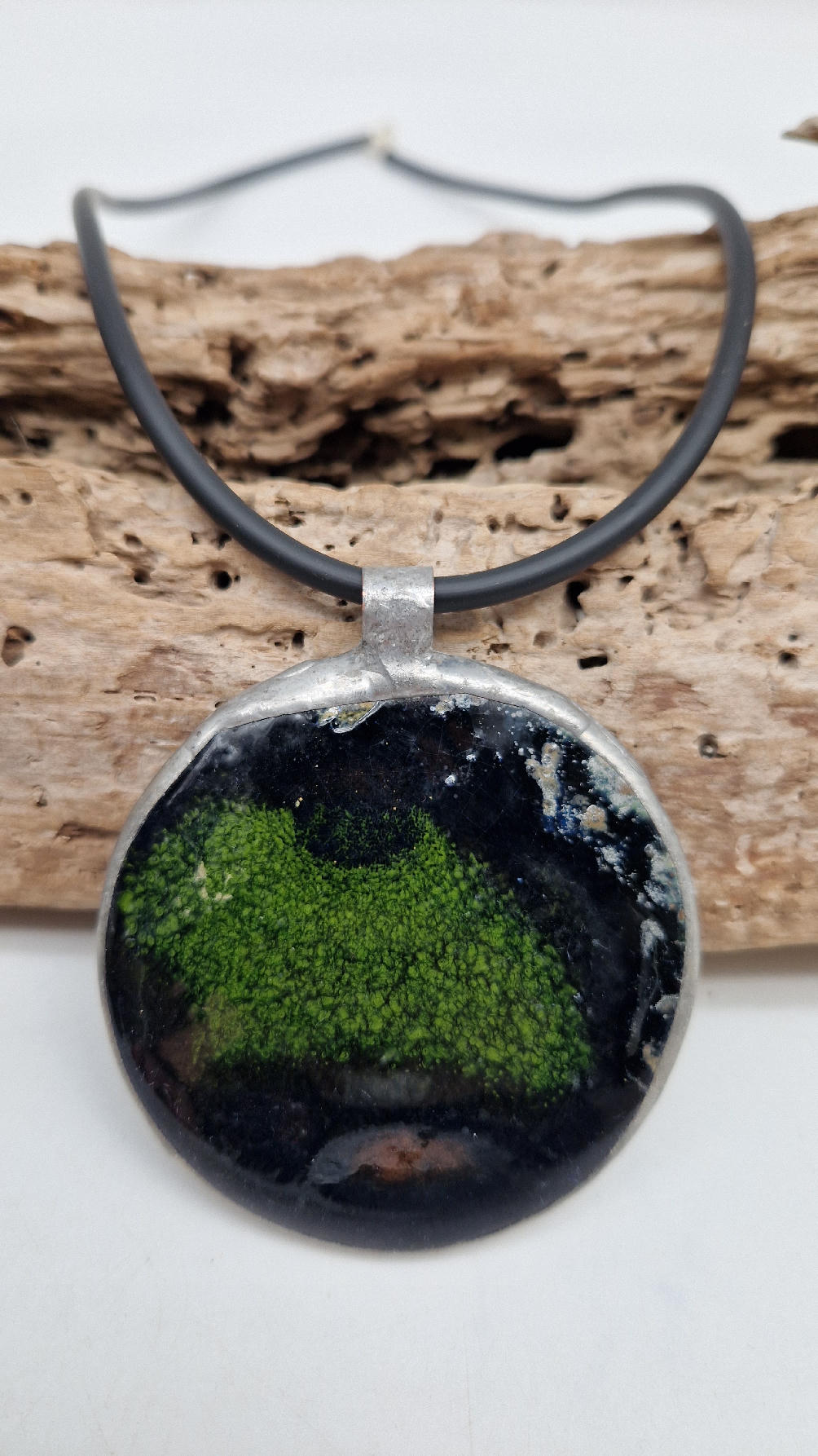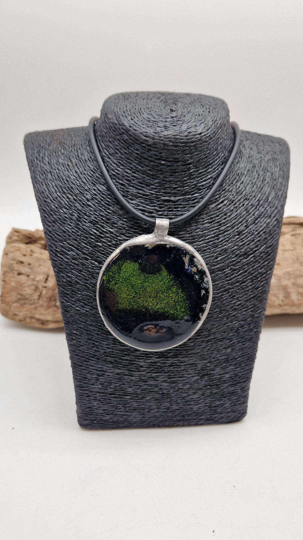 Zieloniasta, bo mega zielona z czarną obwódką piękna Zoe jak zielona wyspa na czarnym jeziorze…Niewielki, a może po prostu ciut mniejszy zielono-czarny wisior z pieknej ceramiki, oprawionej w metal.