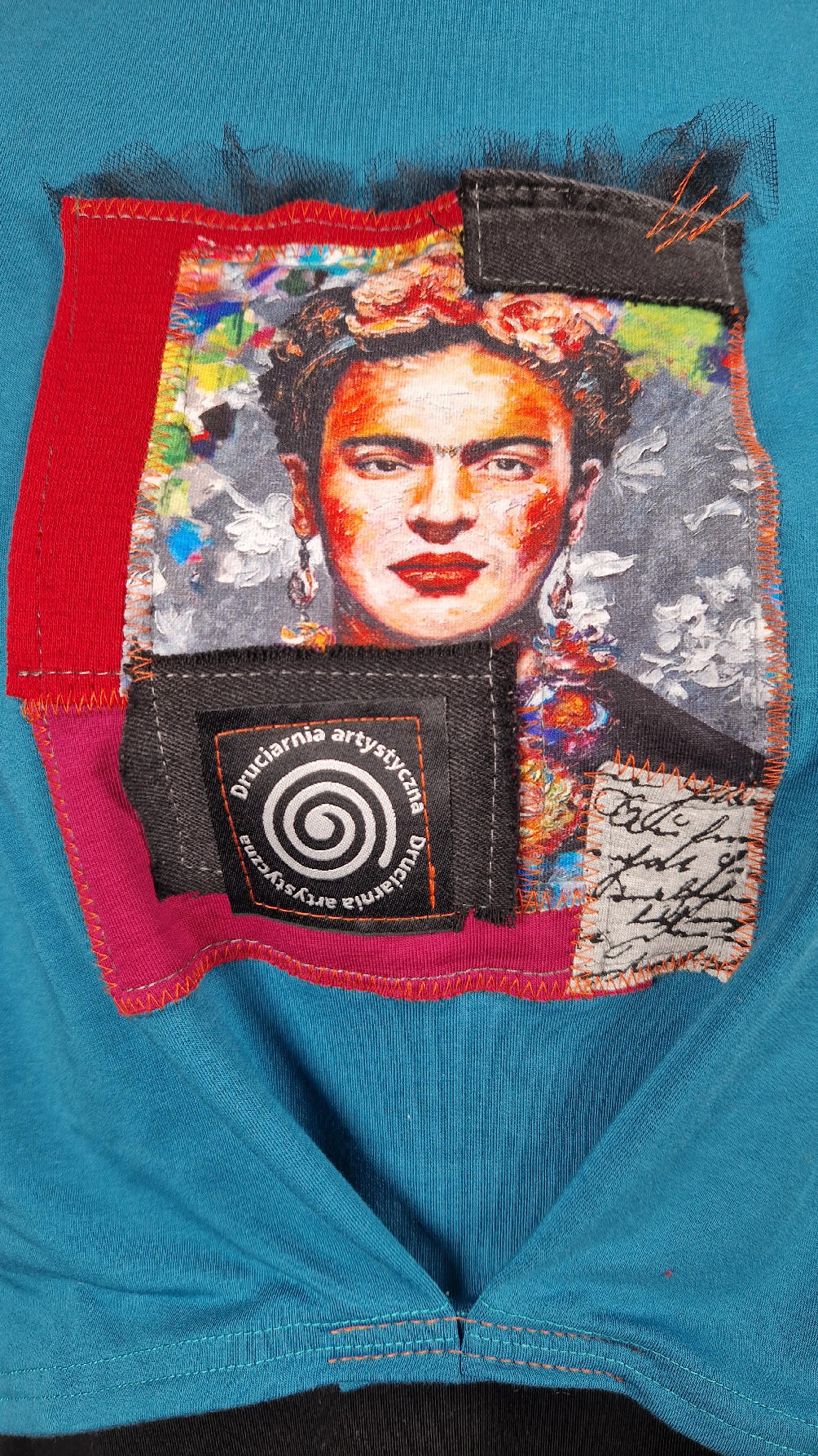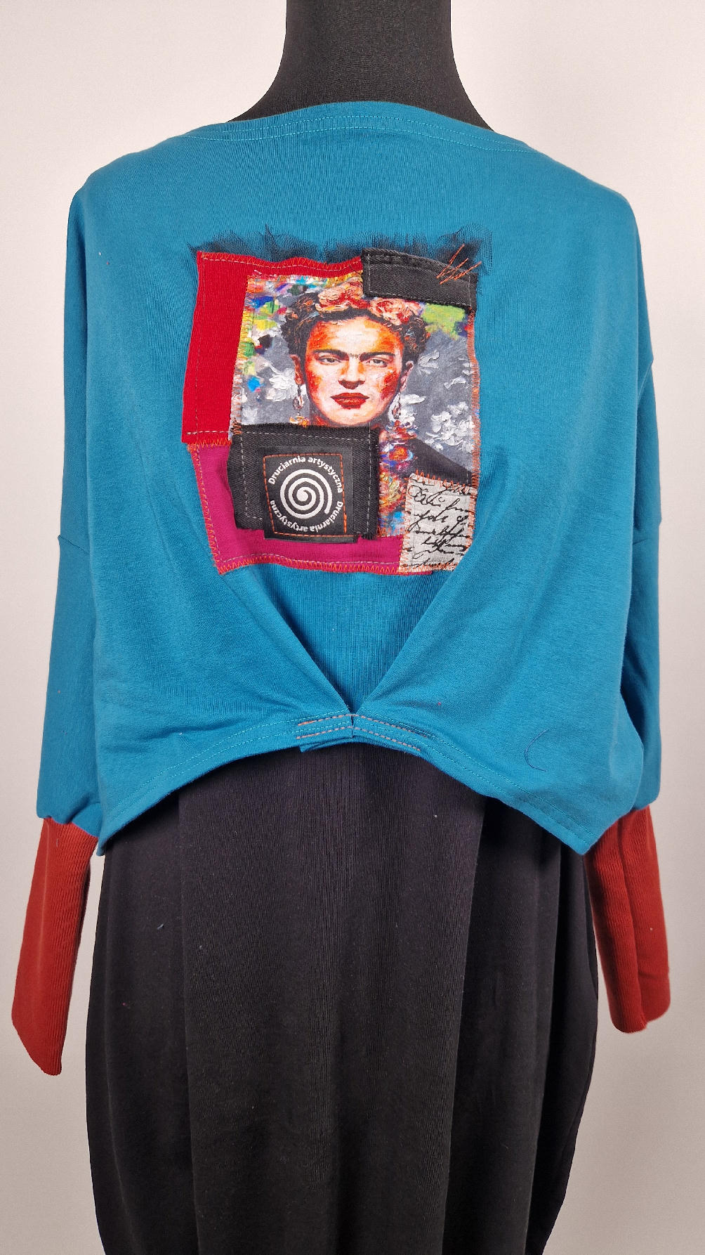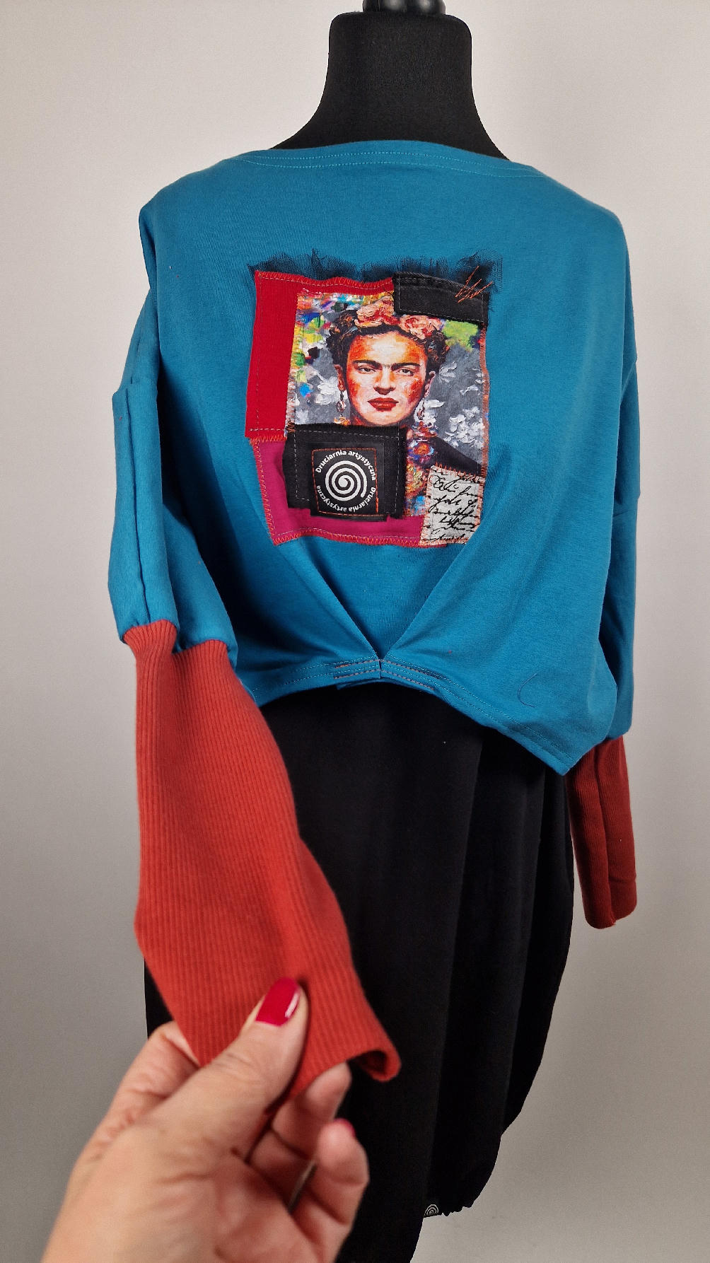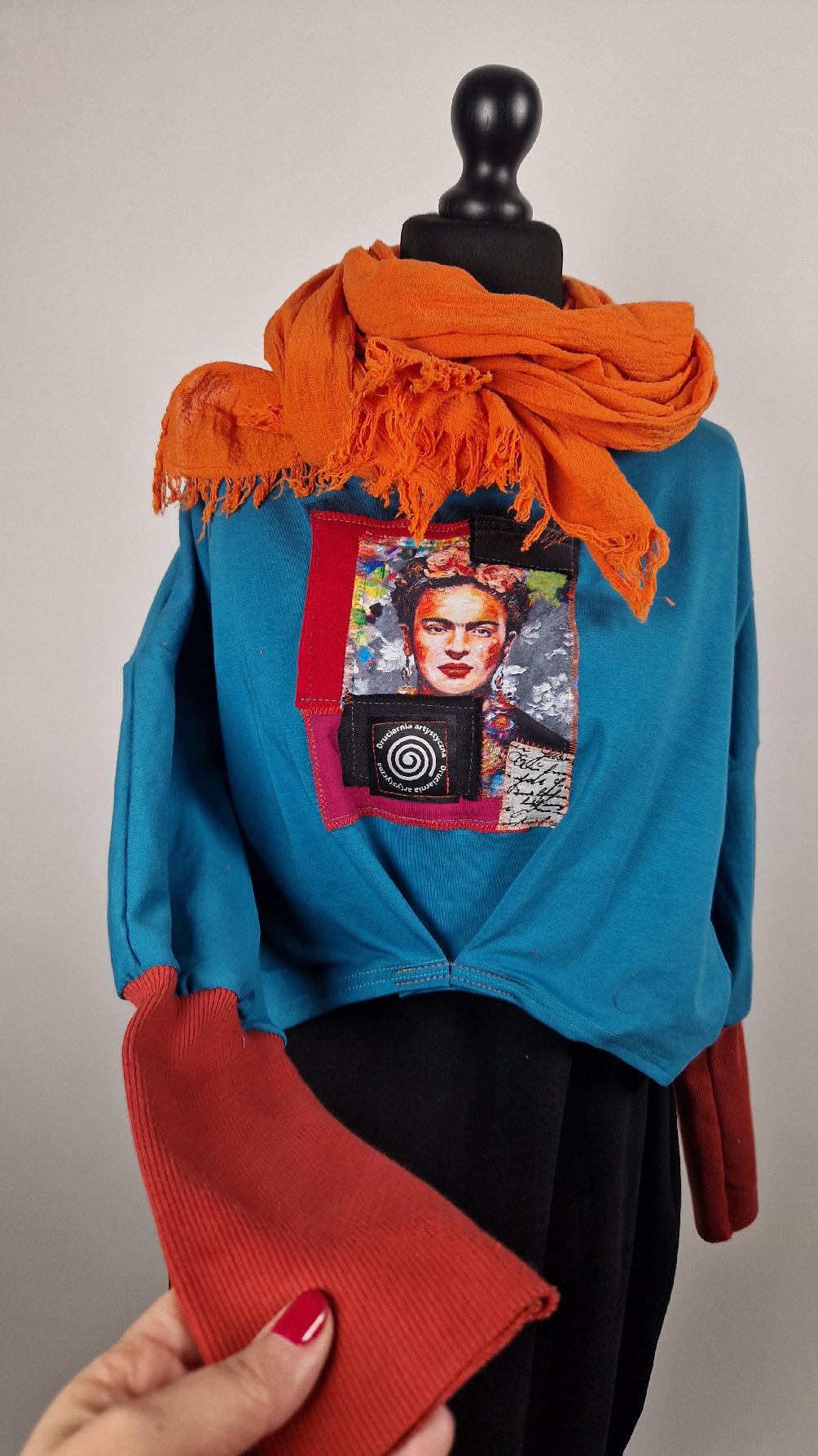 Krótka bluzka z cienkiej, bawełny z pętelką w turkusowym kolorze z kontrastowymi, ciemno-rudymi mankietami. Bluzka jest miękka i wygodna, mankiety otulają nadgarstki, a na środku portret Fridy., skomponowany z kontrastowymi tkaninami. Frida z fioletem , bordem, jeansem – taka ,,luzacka”, i megakolorowa i energetyczna, chociaż baza jest raczej spokojna…