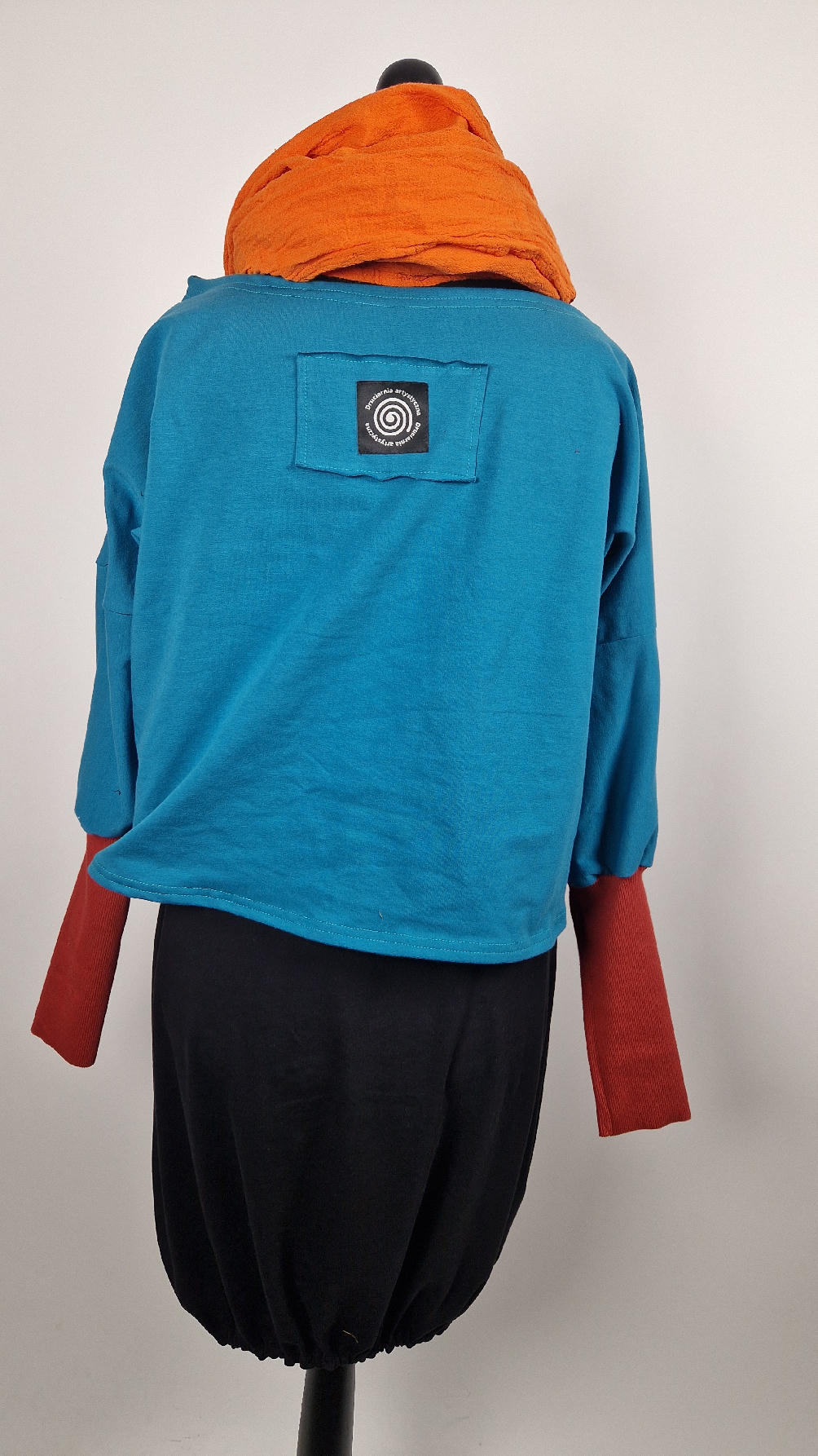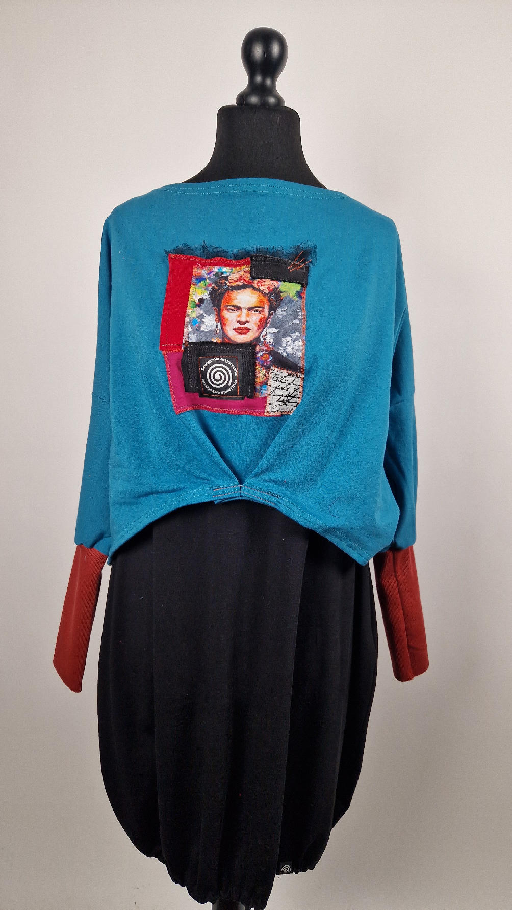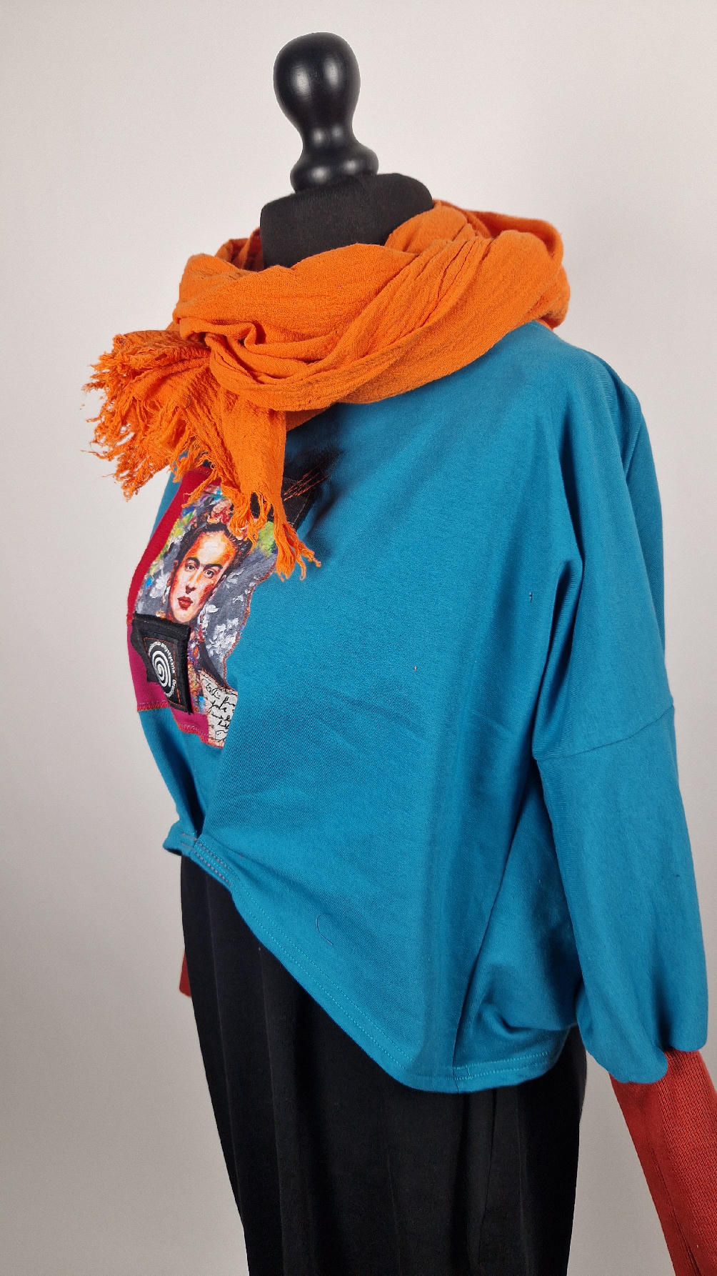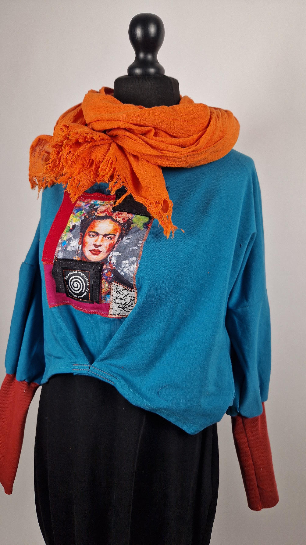 Krótka bluzka z cienkiej, bawełny z pętelką w turkusowym kolorze z kontrastowymi, ciemno-rudymi mankietami. Bluzka jest miękka i wygodna, mankiety otulają nadgarstki, a na środku portret Fridy., skomponowany z kontrastowymi tkaninami. Frida z fioletem , bordem, jeansem – taka ,,luzacka”, i megakolorowa i energetyczna, chociaż baza jest raczej spokojna…