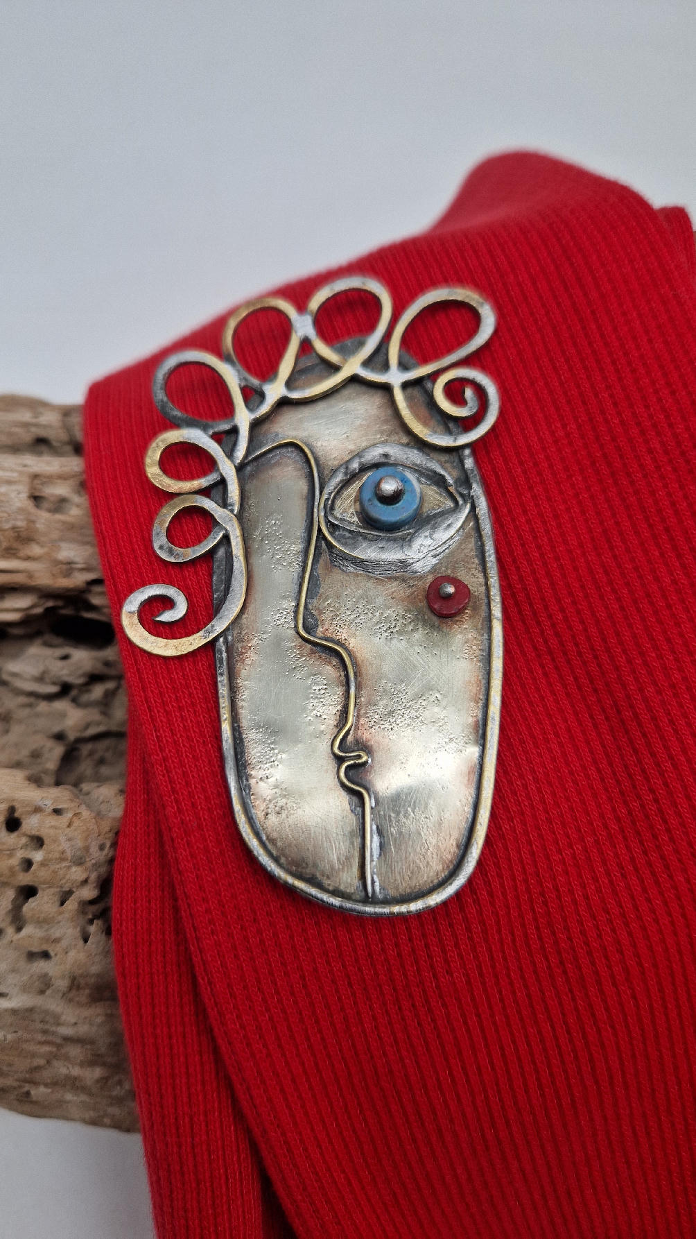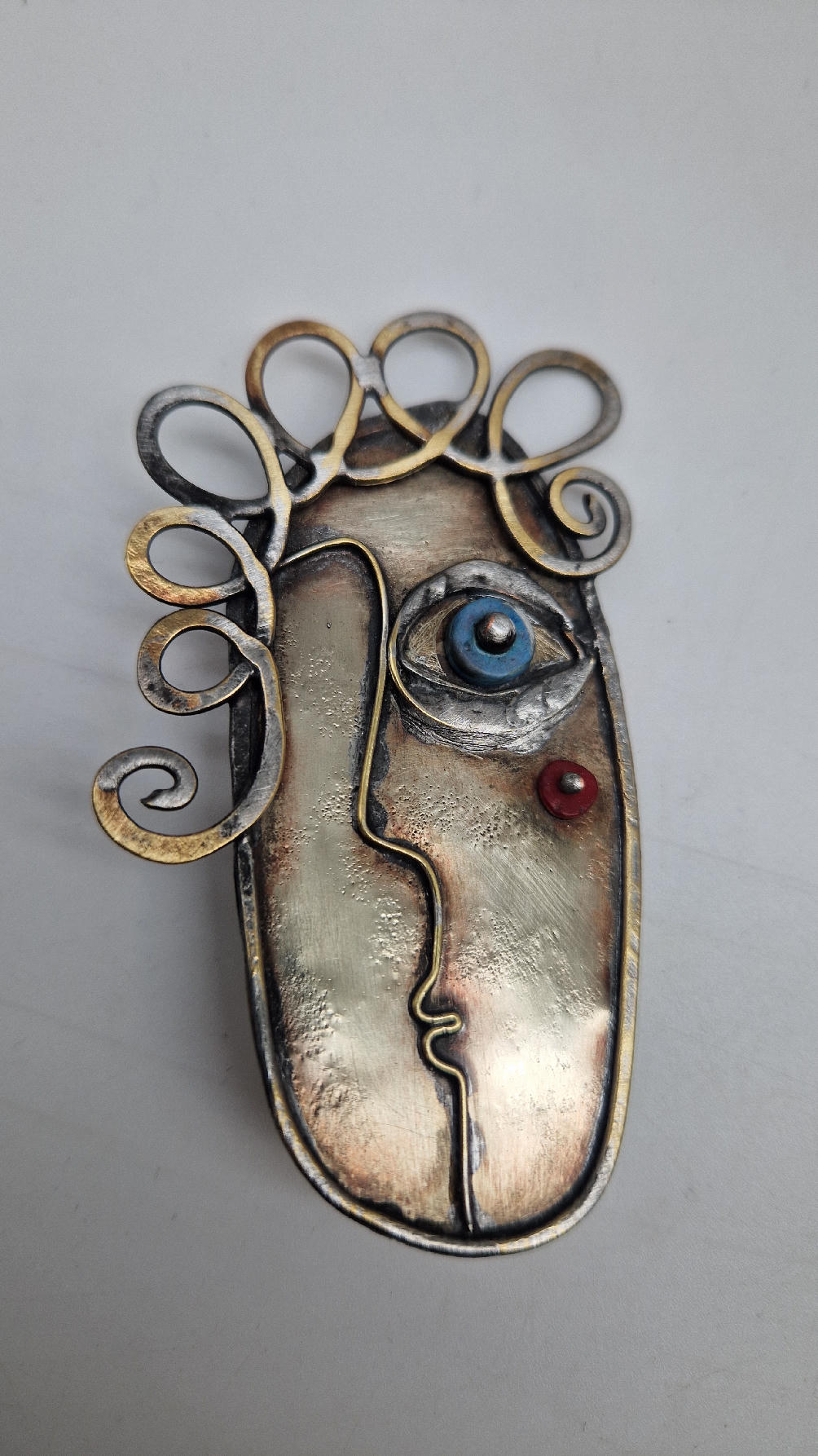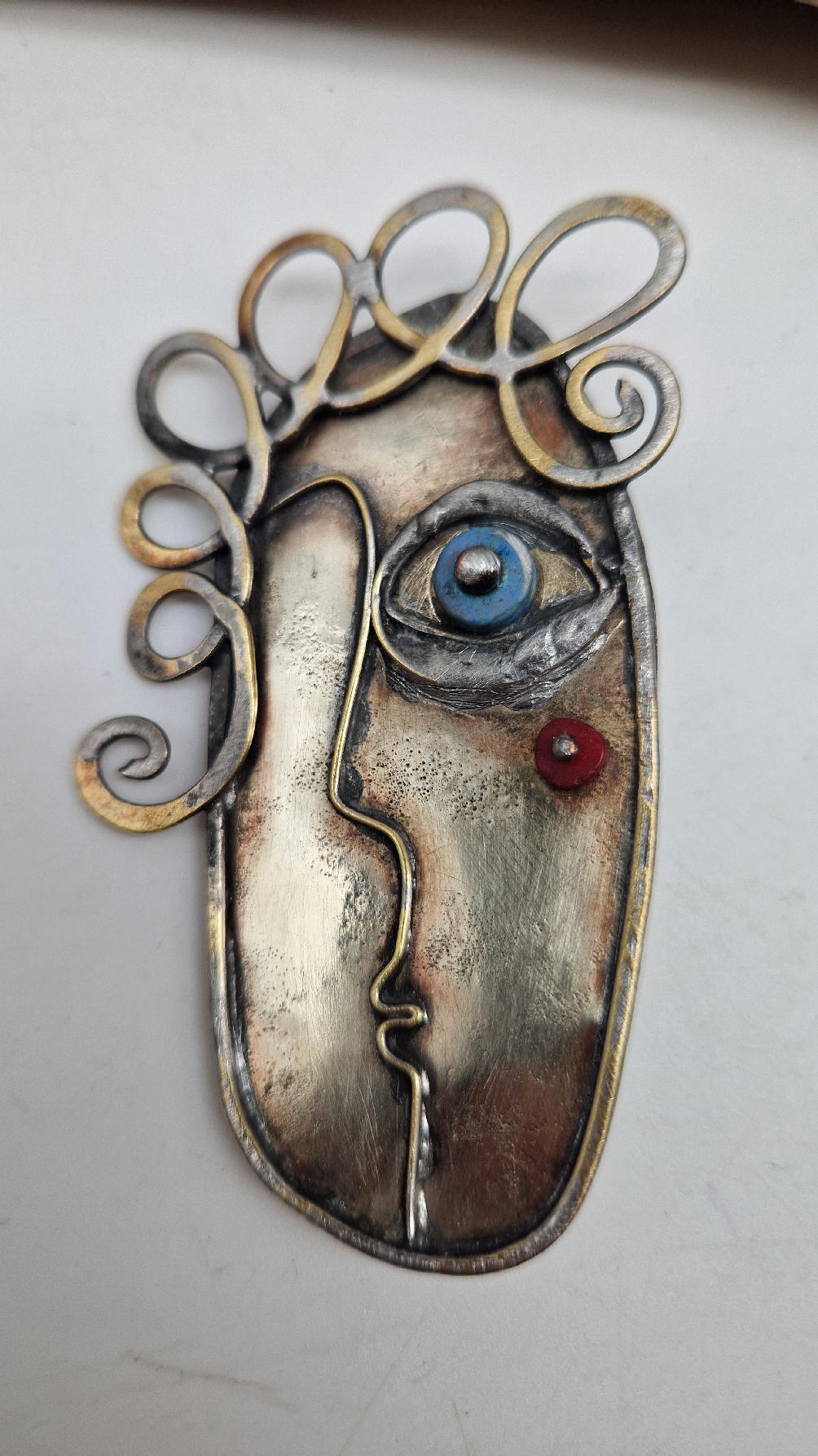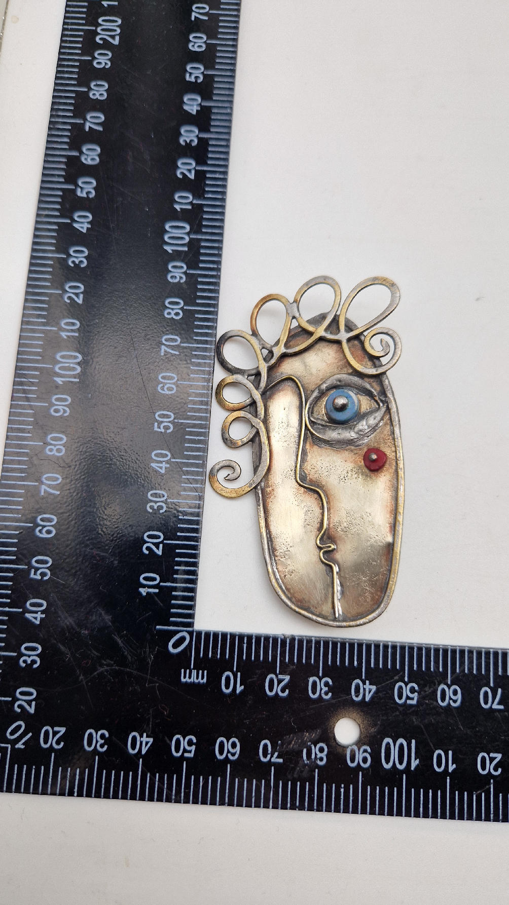 Brocha zrobiona jest z blachy alpakowej i mosiężnego drutu, zapinana na dużą szpilę, usta pokryte emalią, oko z turkusu