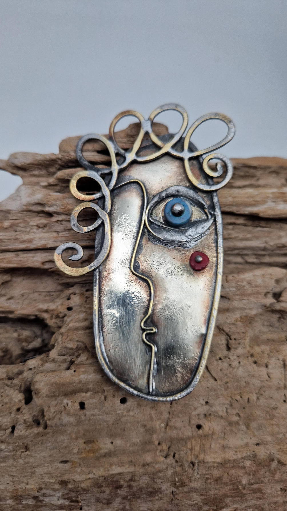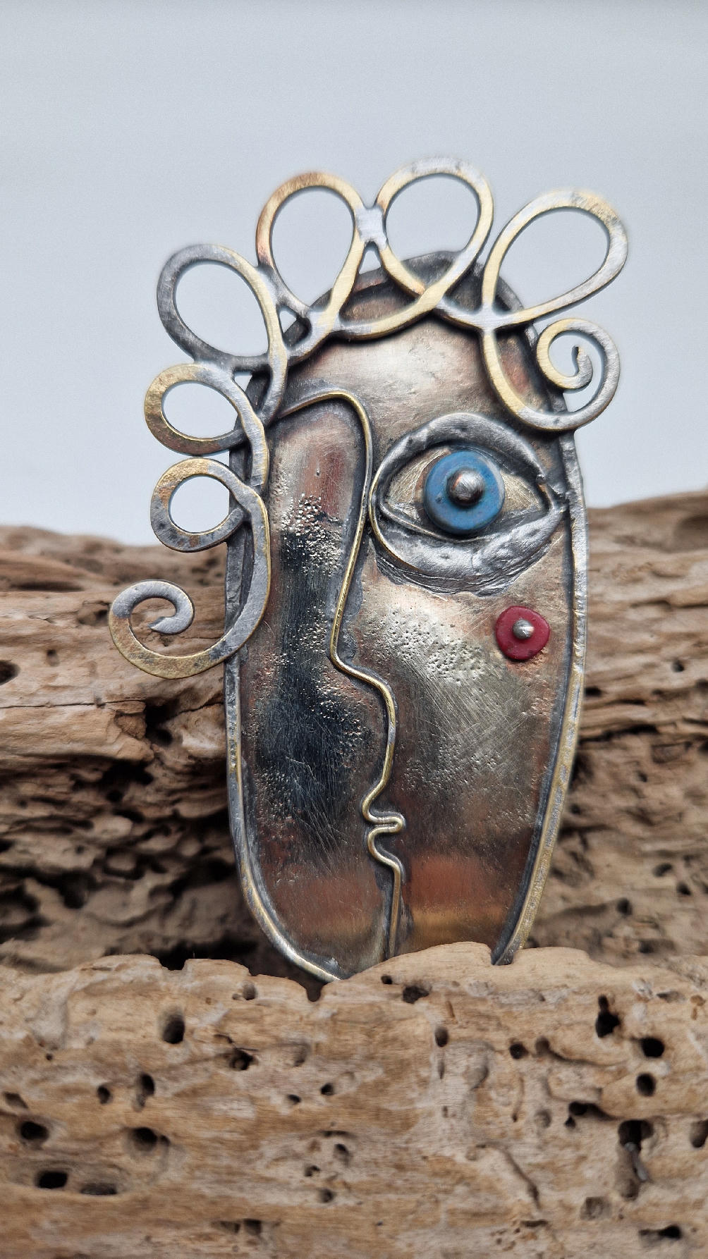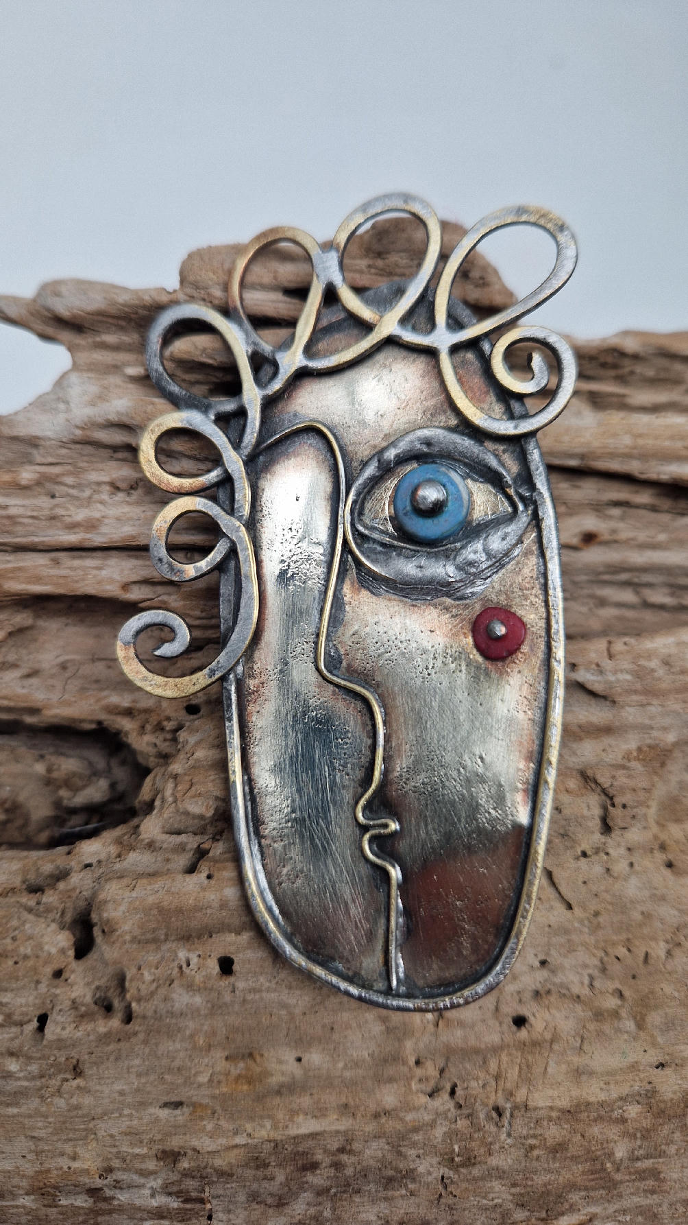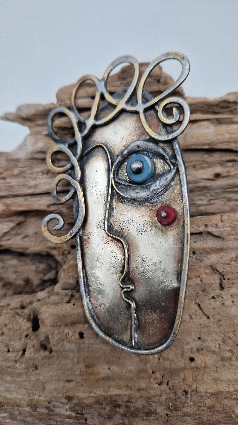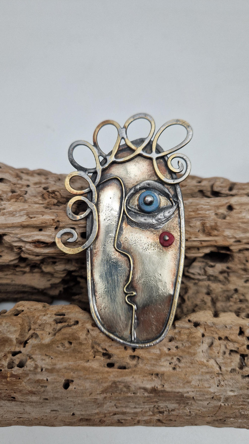 Brocha zrobiona jest z blachy alpakowej i mosiężnego drutu, zapinana na dużą szpilę, usta pokryte emalią, oko z turkusu