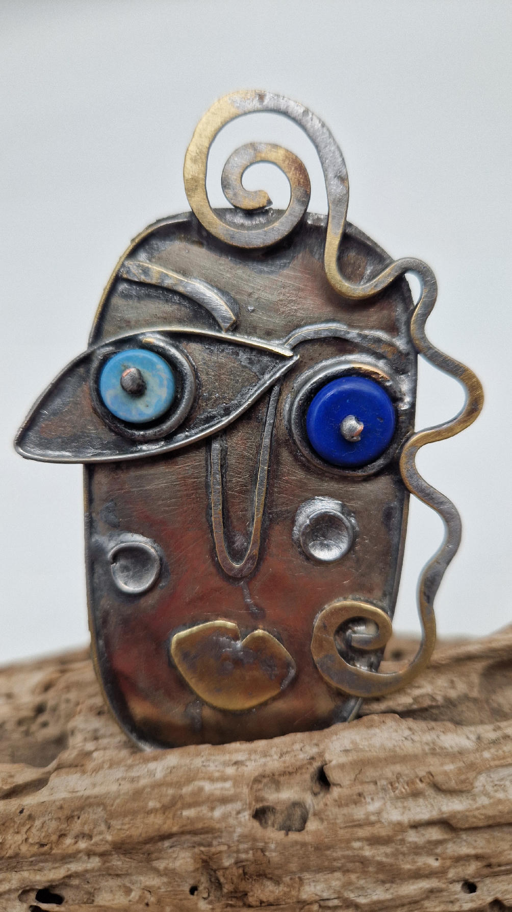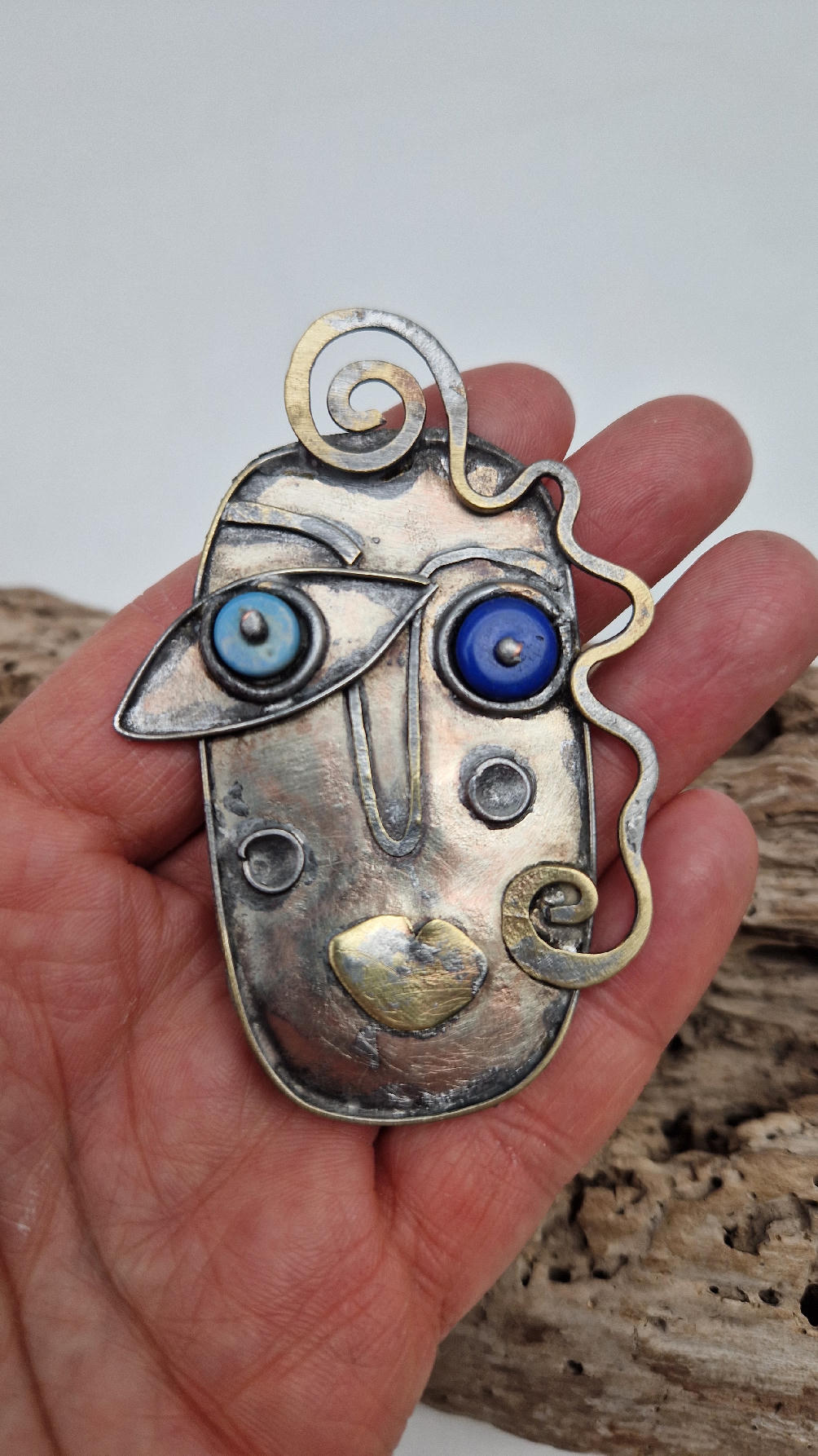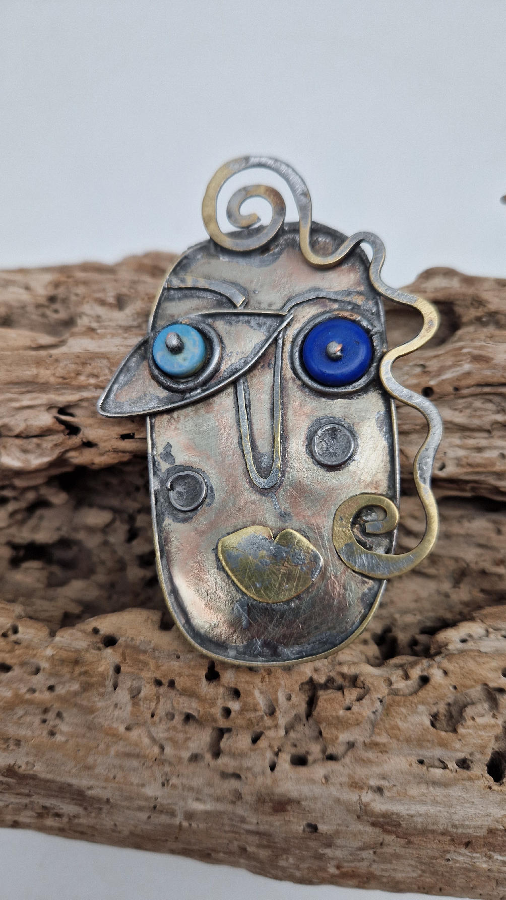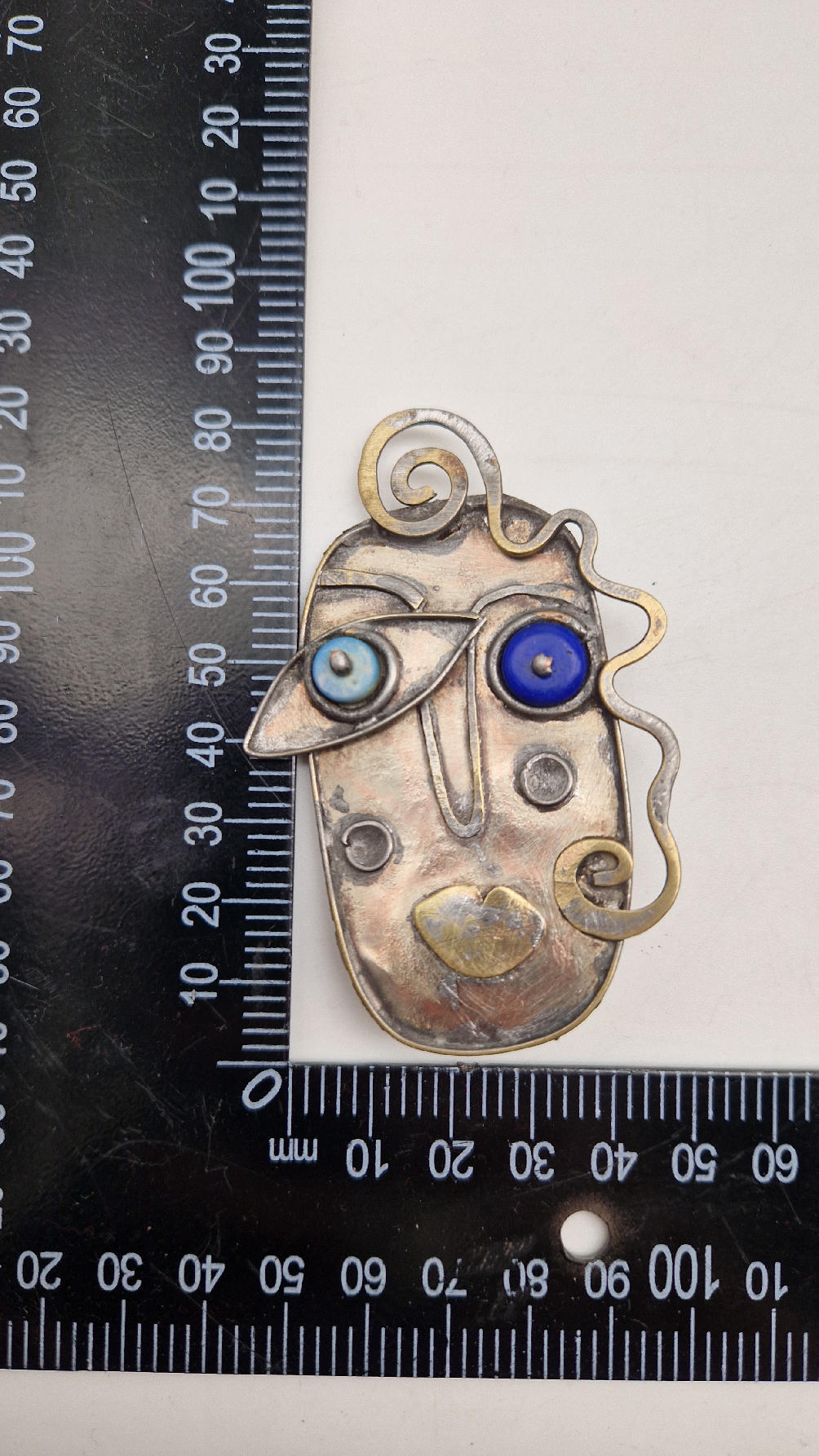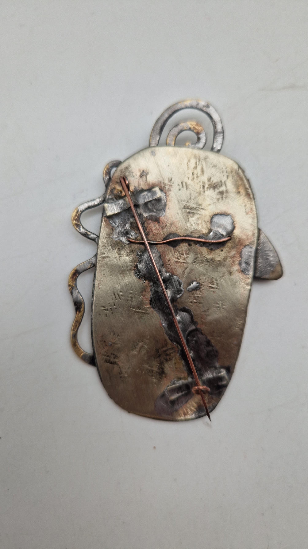 Brocha zrobiona jest z blachy alpakowej i mosiężnego drutu, zapinana na dużą szpilę, , oczy z turkmenitów