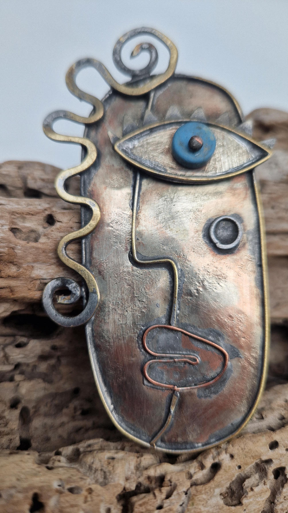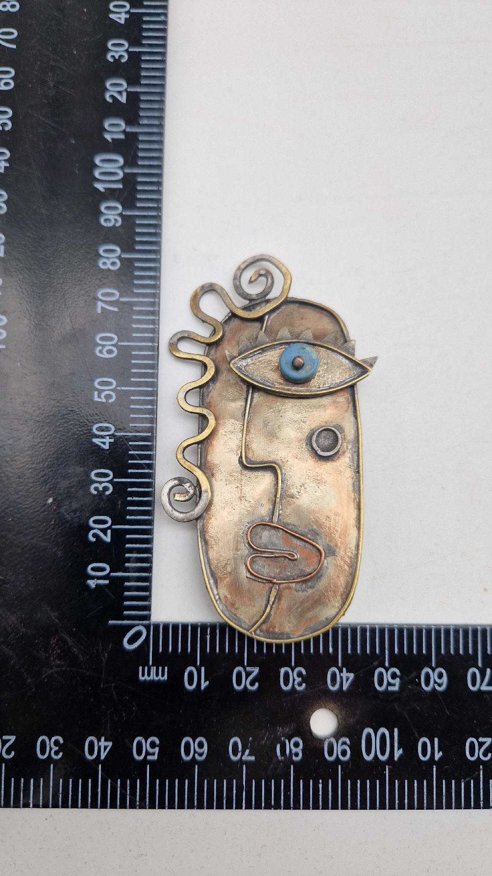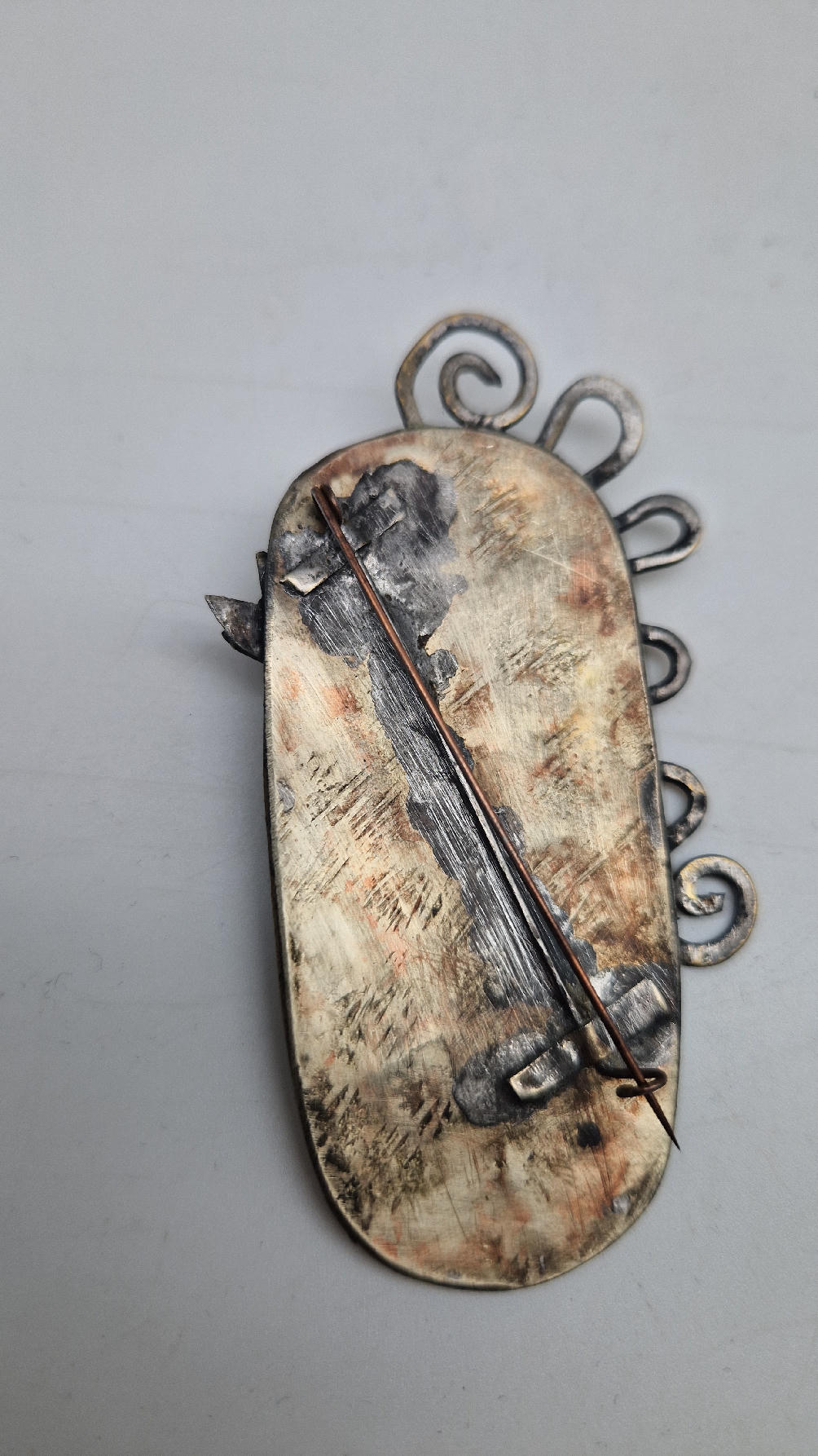 Brocha zrobiona jest z blachy alpakowej i mosiężnego drutu, zapinana na dużą szpilę, , oczy z turkmenitów