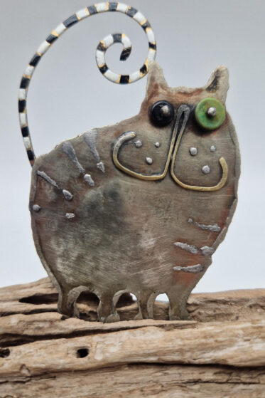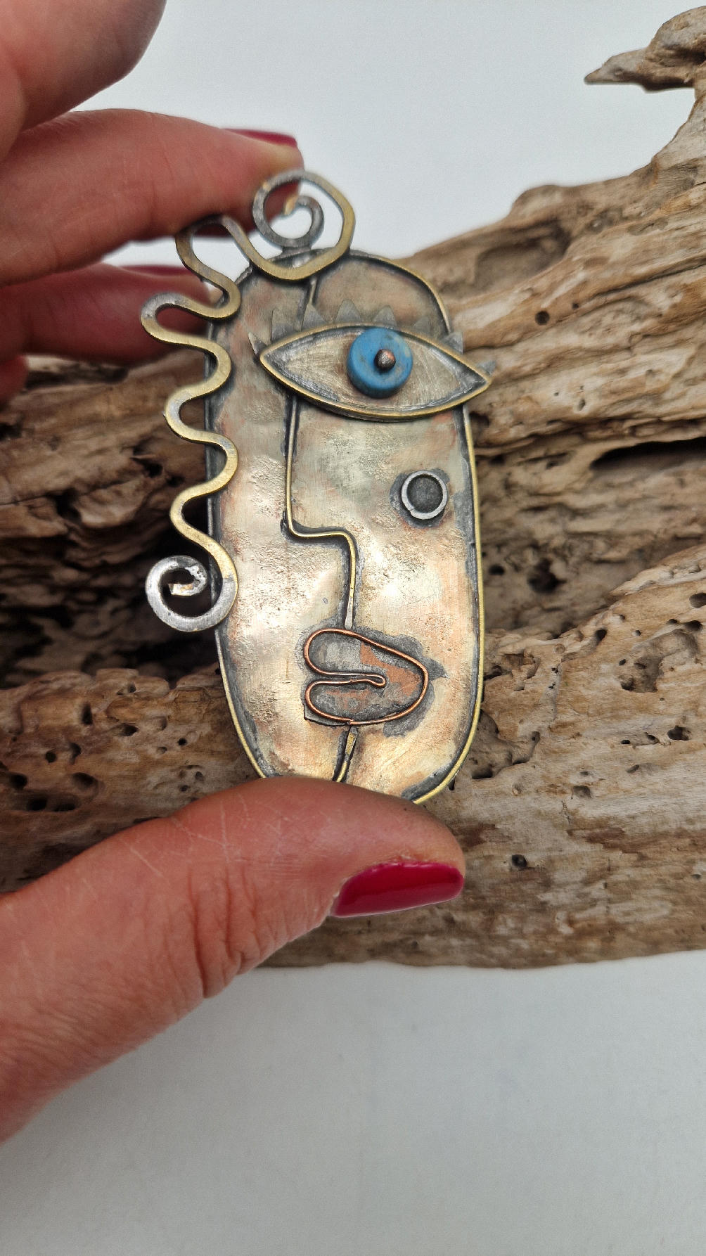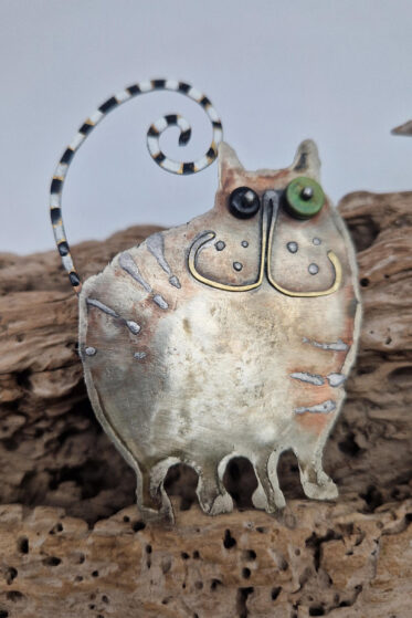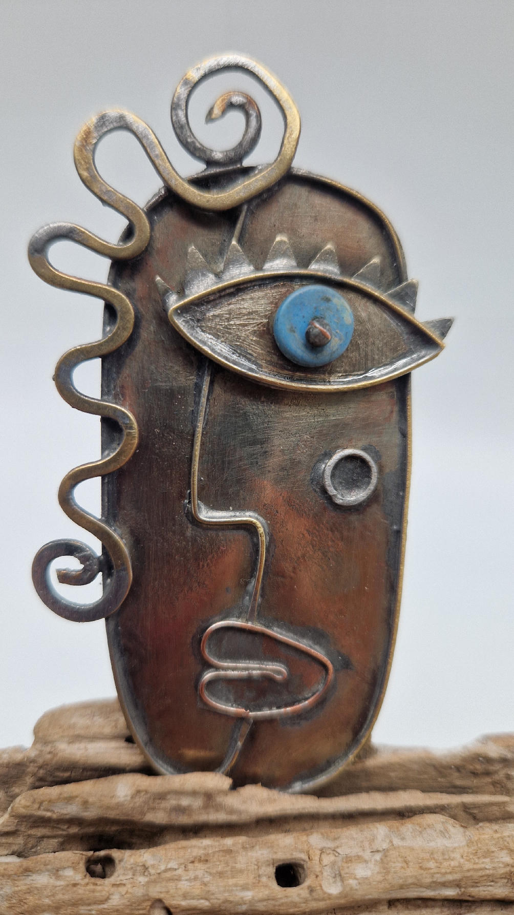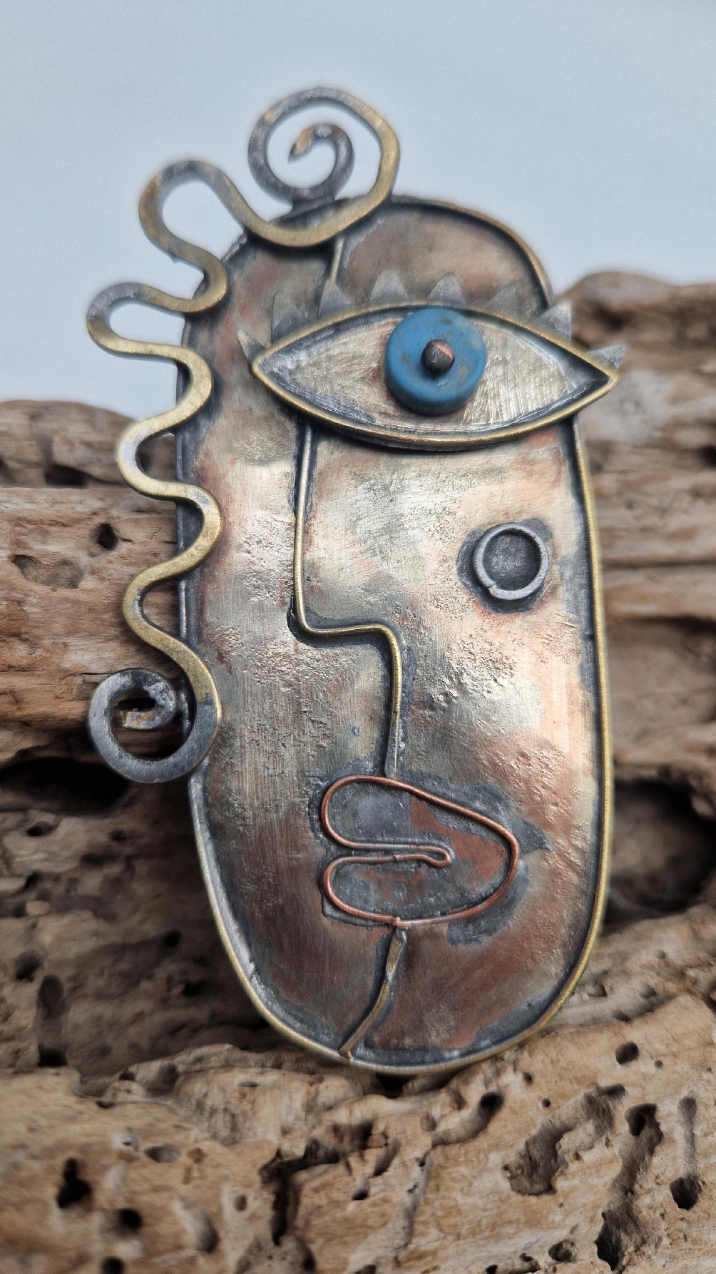 Brocha zrobiona jest z blachy alpakowej i mosiężnego drutu, zapinana na dużą szpilę, , oczy z turkmenitów