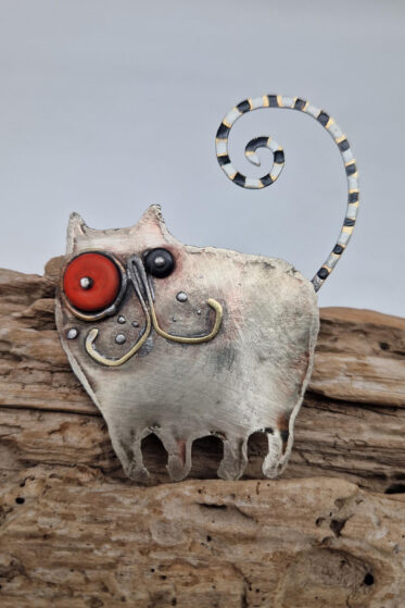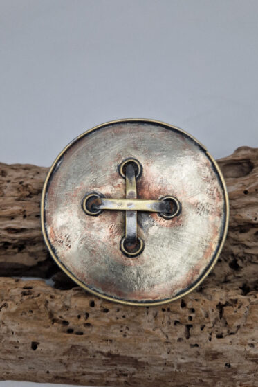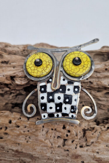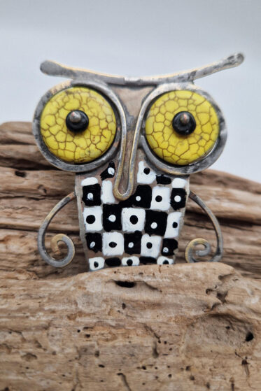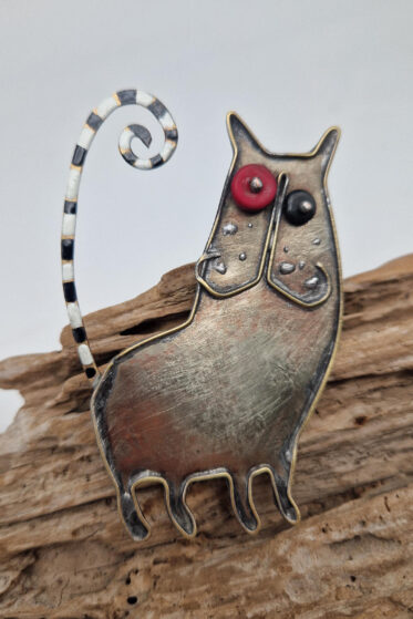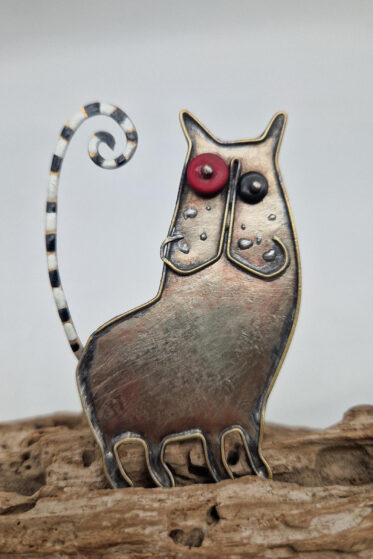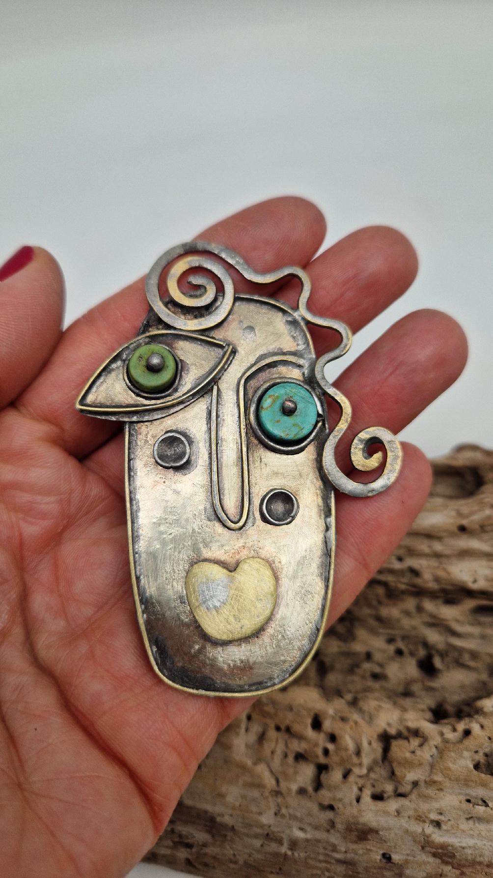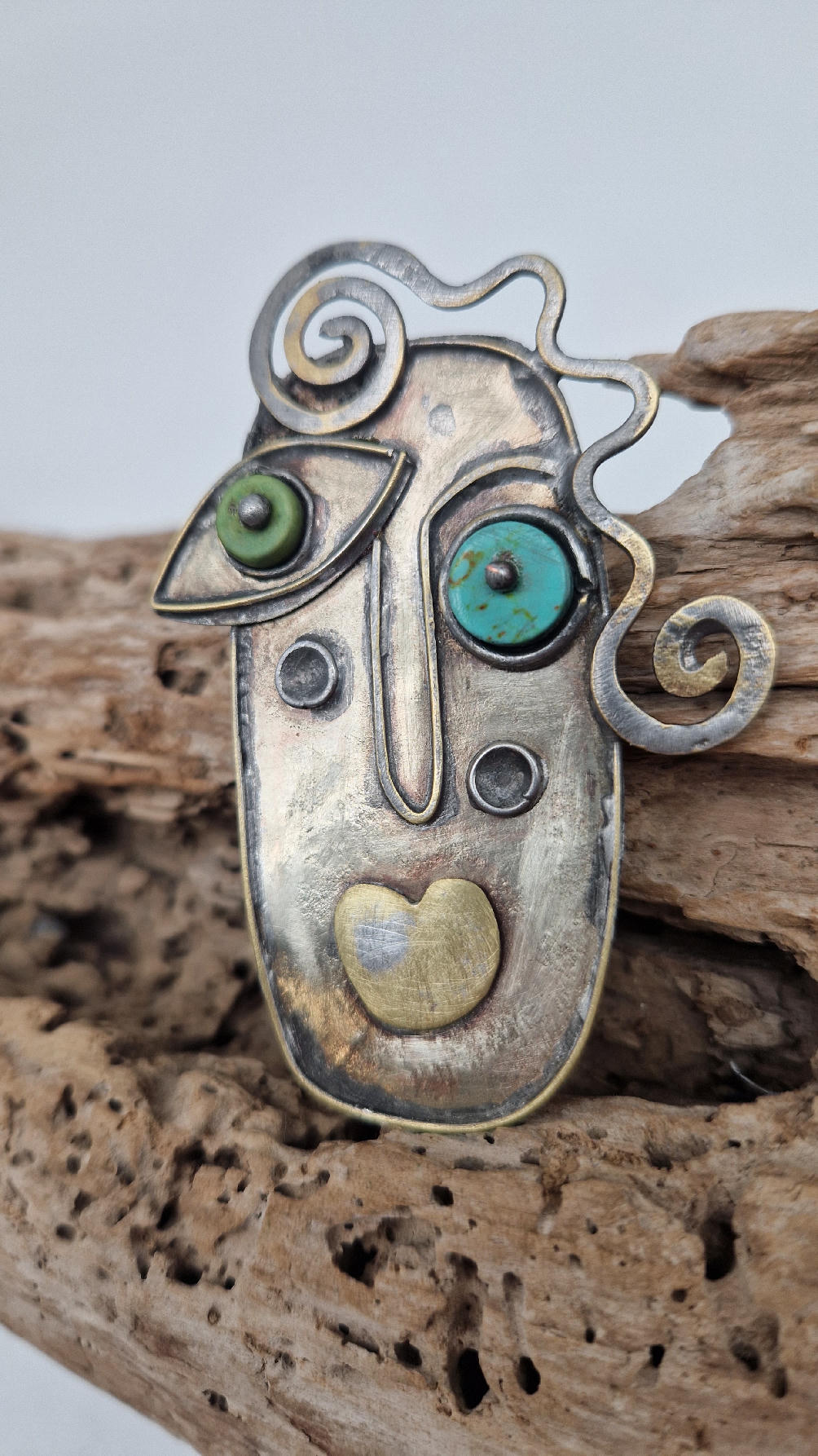 Brocha zrobiona jest z blachy alpakowej i mosiężnego drutu, zapinana na dużą szpilę, , oczy z turkmenitów