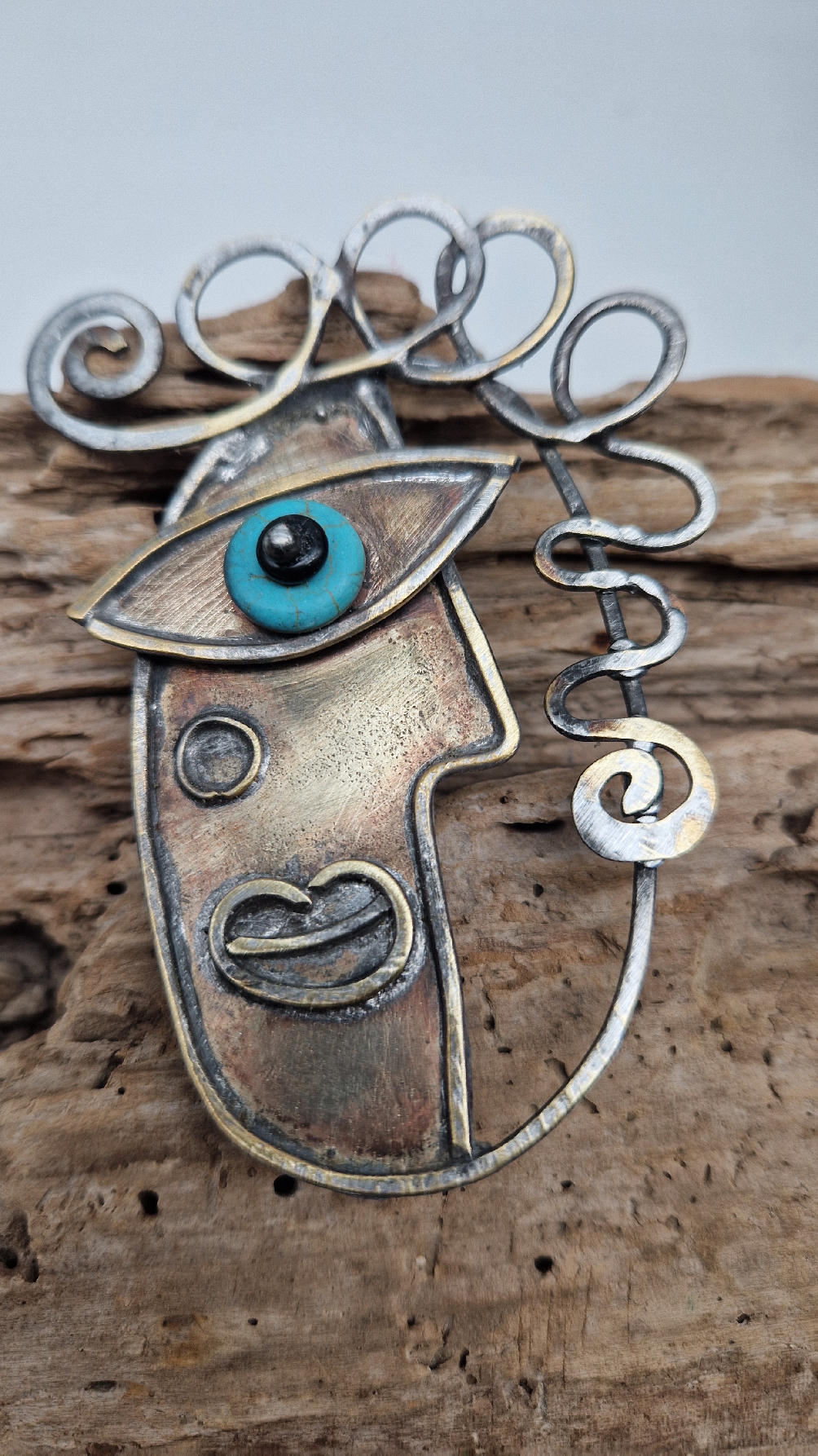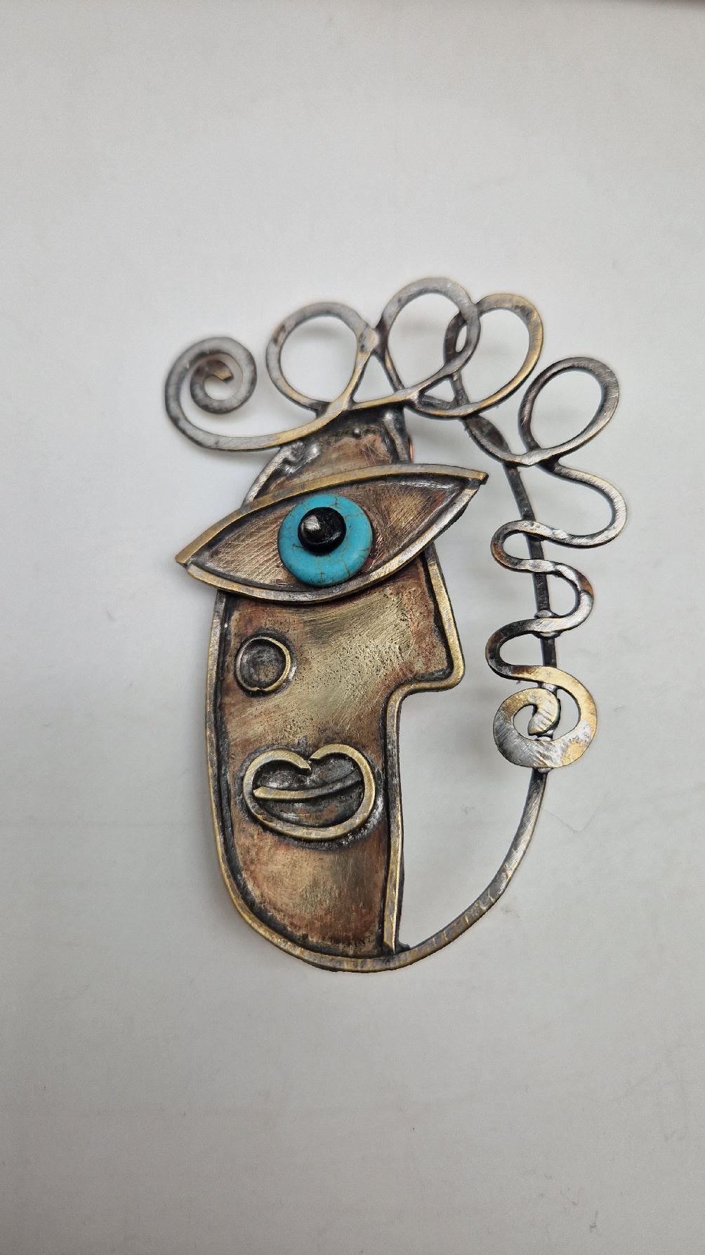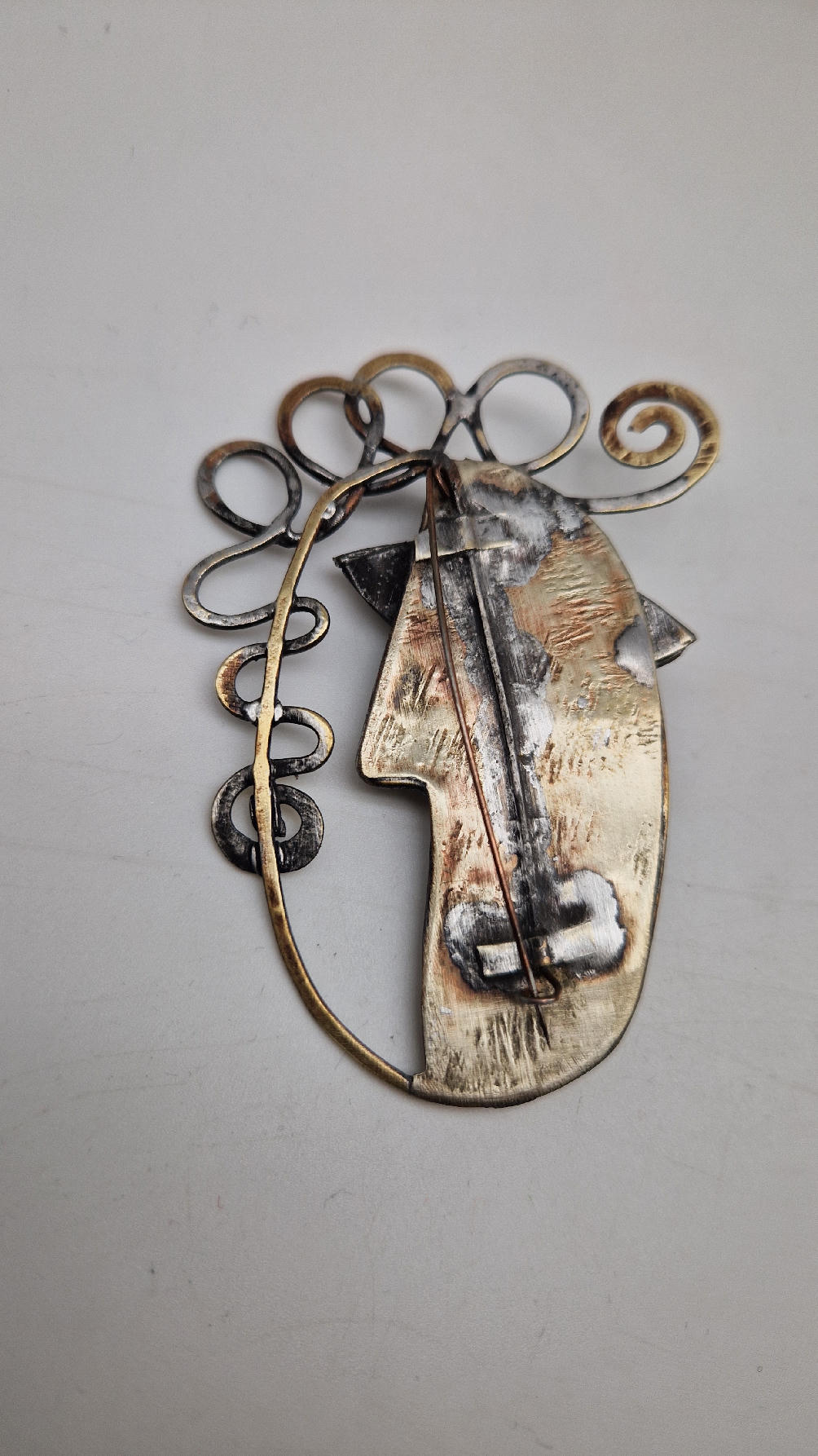 Duża, urocza, uwodząca i rozweselająca, cudna i niepowtarzalna Brocha . Czysta radość, która przeniesie Cię do świata tajemnicy i elegancji. Ta ręcznie wykonana brocha, wykonana z blachy alpakowej (nowe srebro) i miedzi, jest nie tylko ozdobą, ale także wyrazem mistycznego uroku.