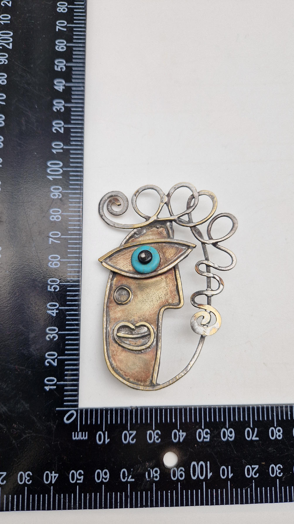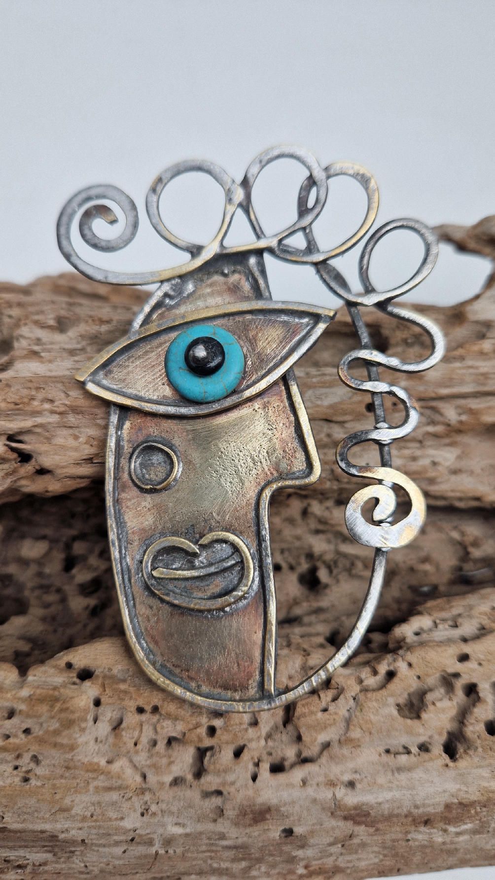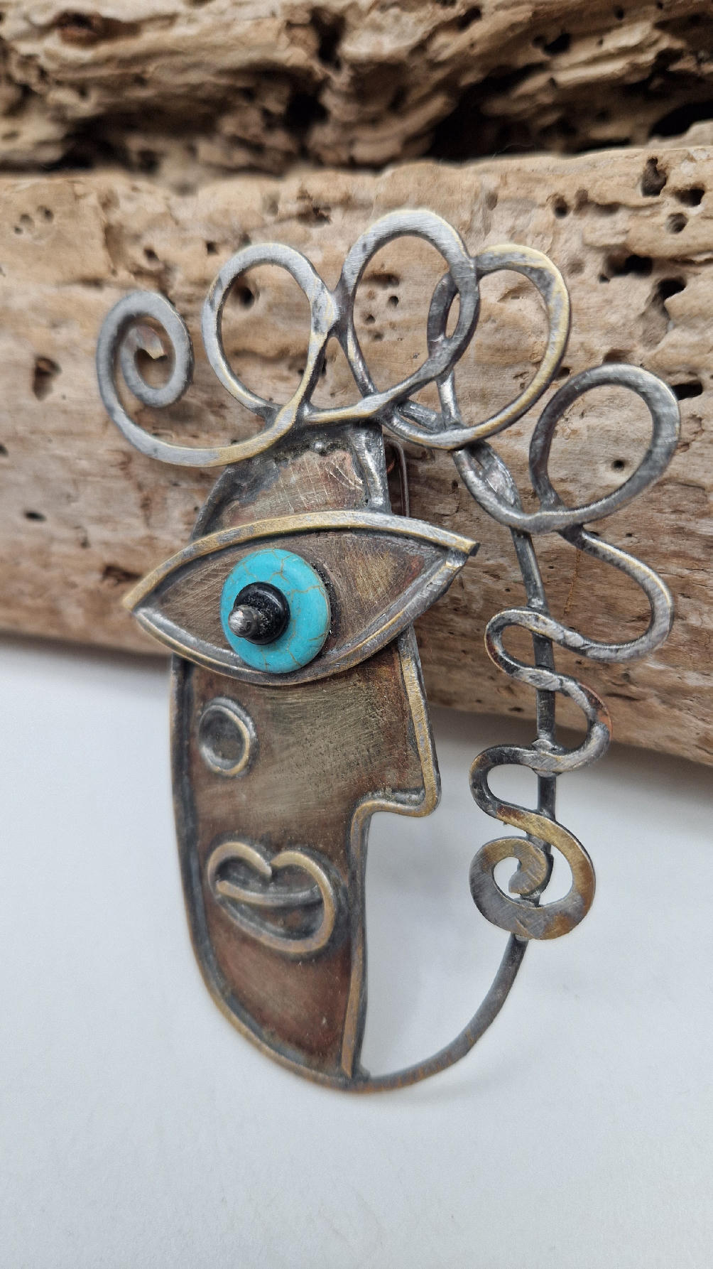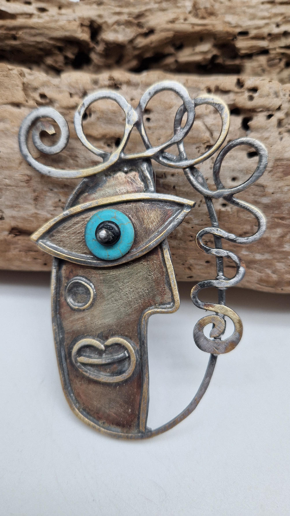 Duża, urocza, uwodząca i rozweselająca, cudna i niepowtarzalna Brocha . Czysta radość, która przeniesie Cię do świata tajemnicy i elegancji. Ta ręcznie wykonana brocha, wykonana z blachy alpakowej (nowe srebro) i miedzi, jest nie tylko ozdobą, ale także wyrazem mistycznego uroku.
