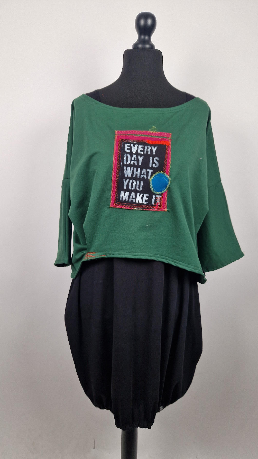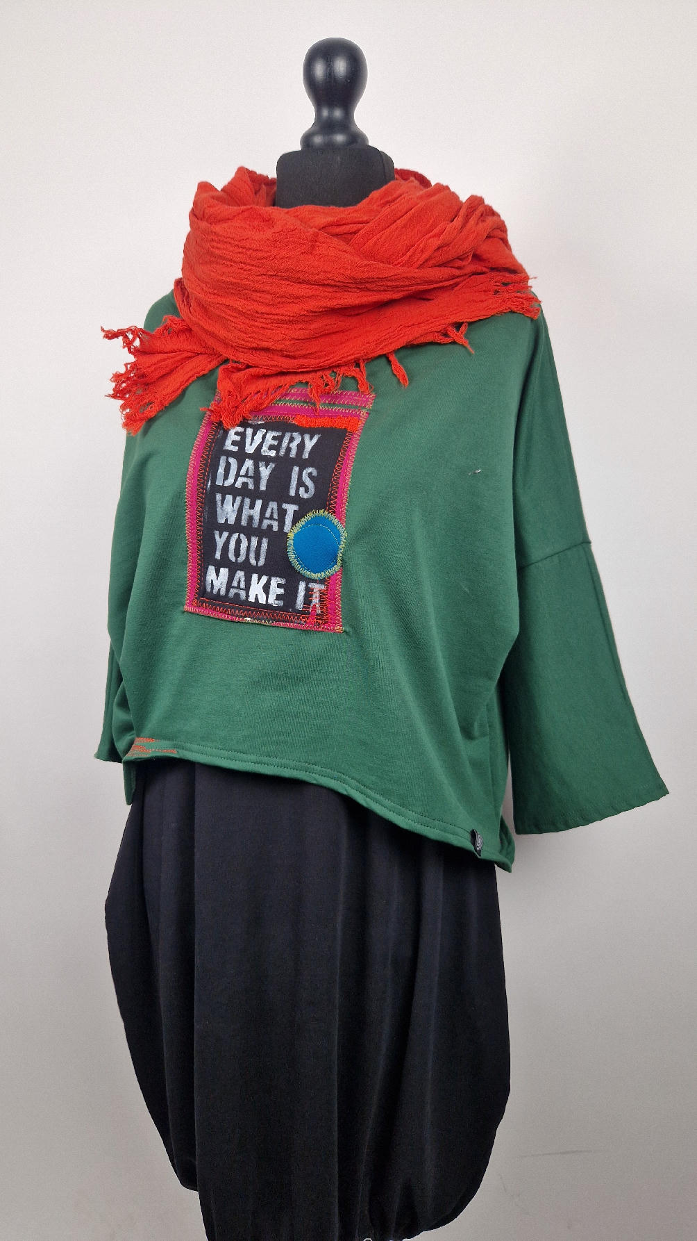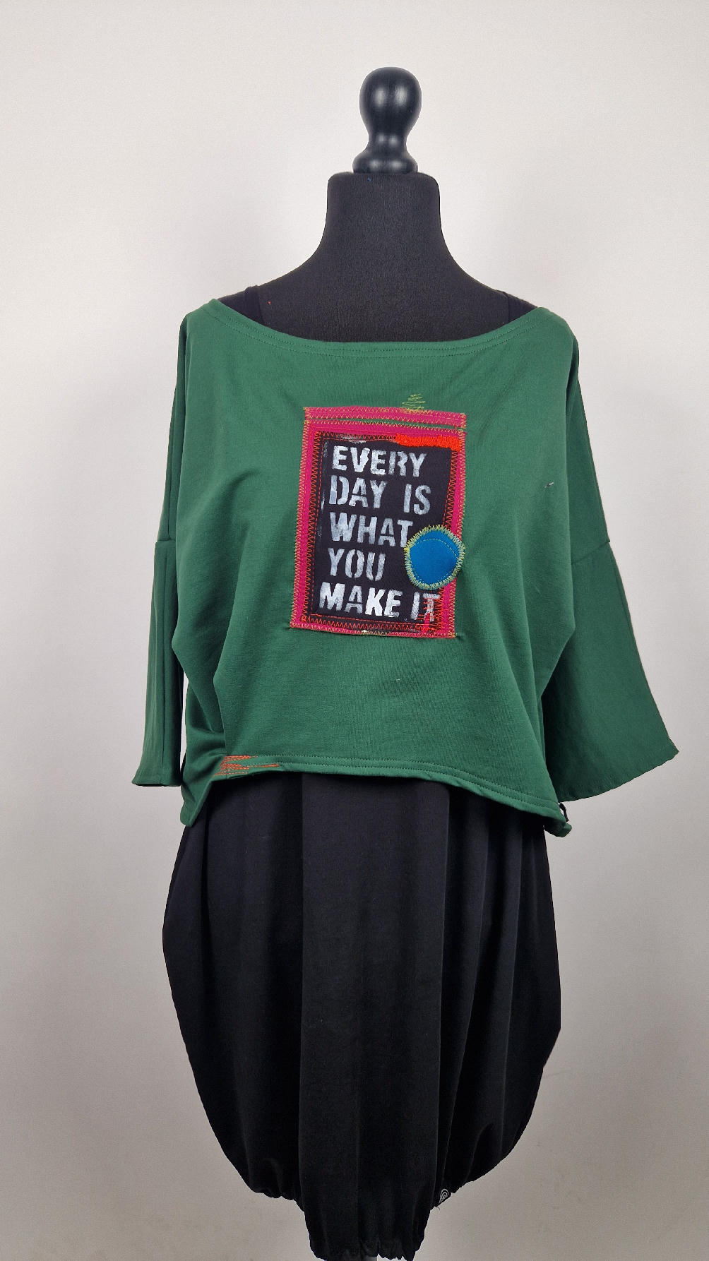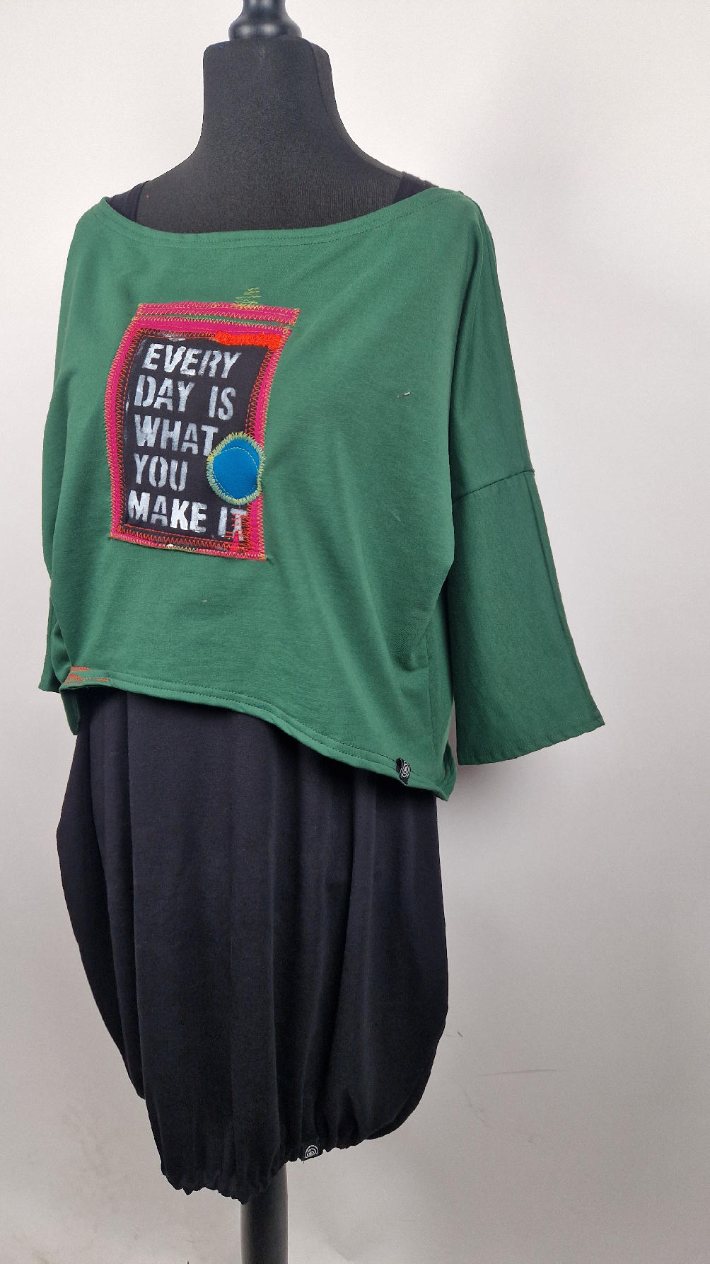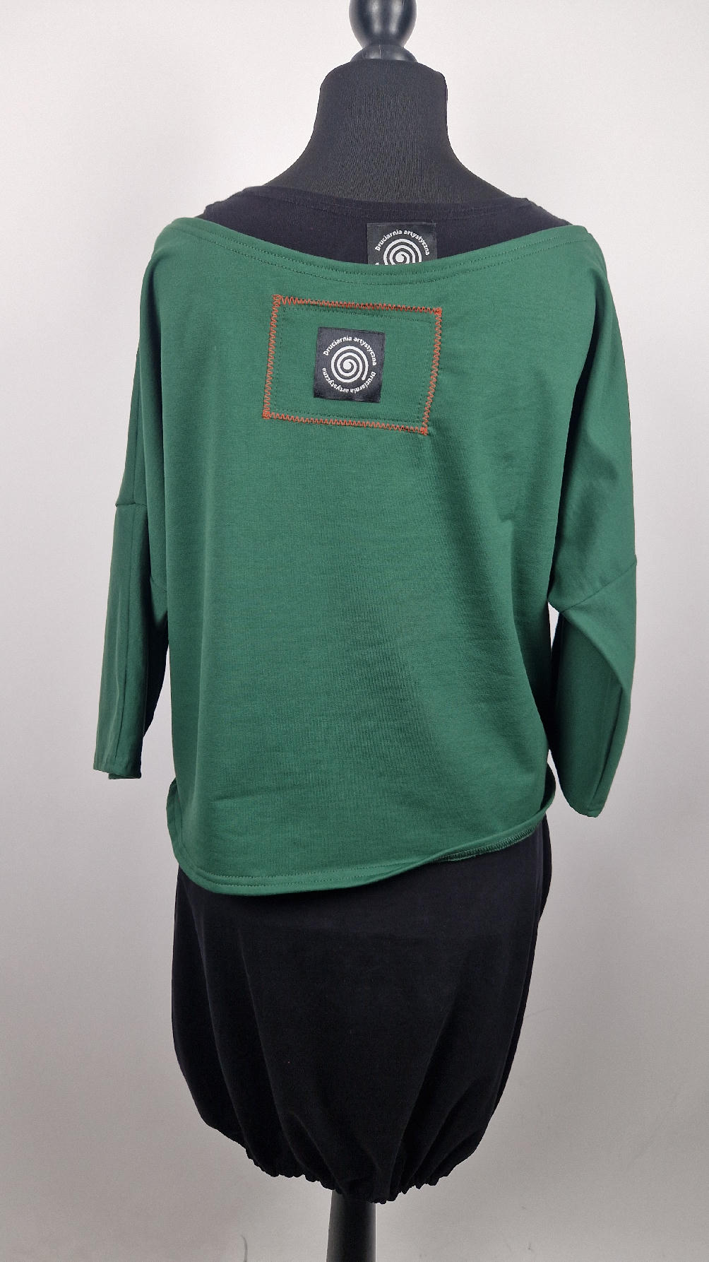 Krótka, zielona , taka liściasta bluzka z aplikacją z napisem, z kontrastowymi dodatkami. …Luźna w biuście bluzka typu NIETOPERZ, ale taki niewielki….bluzka uszyta z wysokiej jakości bawełny z pętelką, z rękawem 3/4… , lekko zebrana na dole, żeby układała się bardziej… prosta, bez kieszeni – tak specjalnie, żeby nic nie odstawało ale z dużym dekoltem typu ,,łódka”, który możesz opuścić na jedno ramię, lub nosić symetrycznie…możesz założyć do niej ZARĘKAWKI