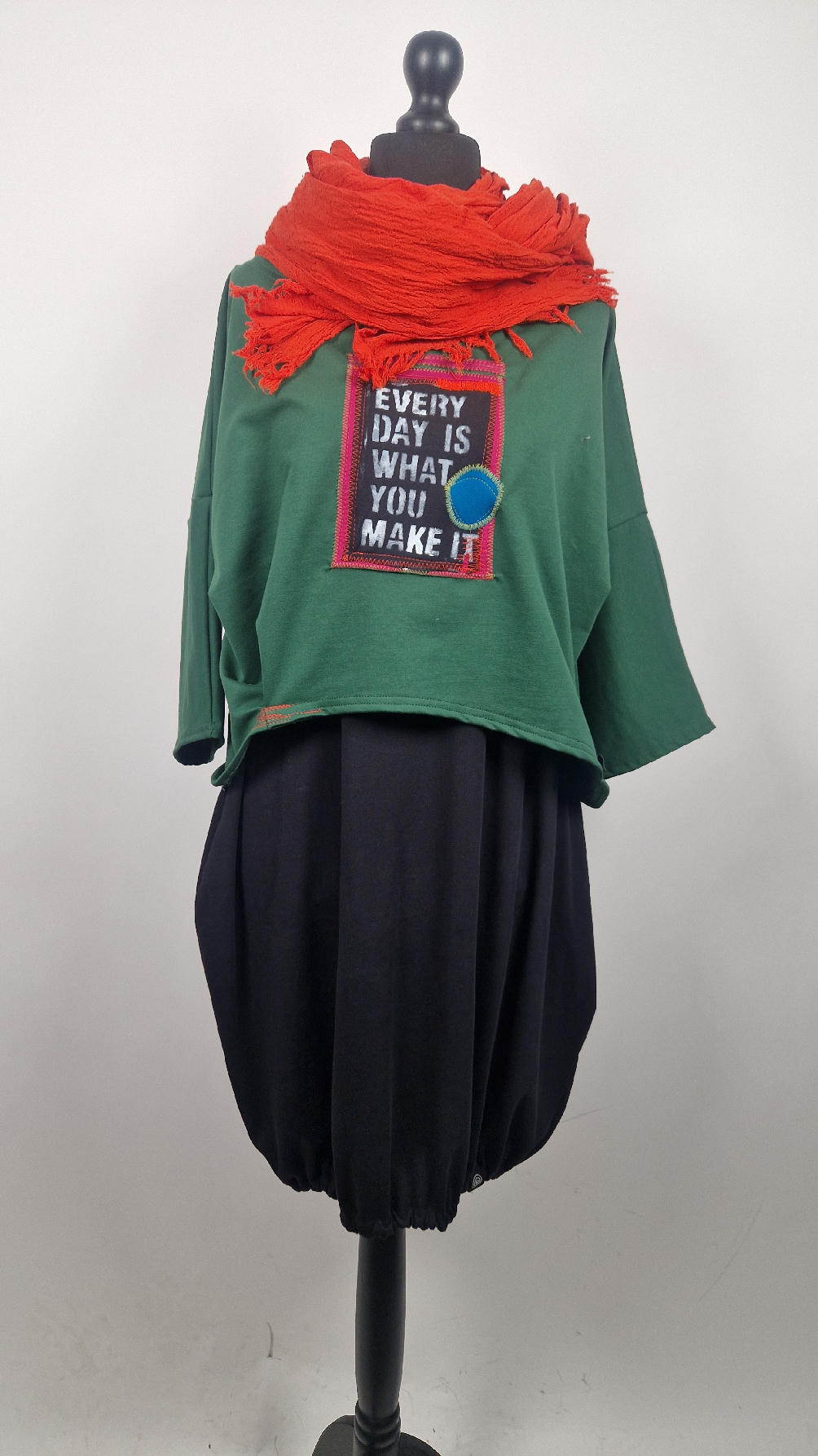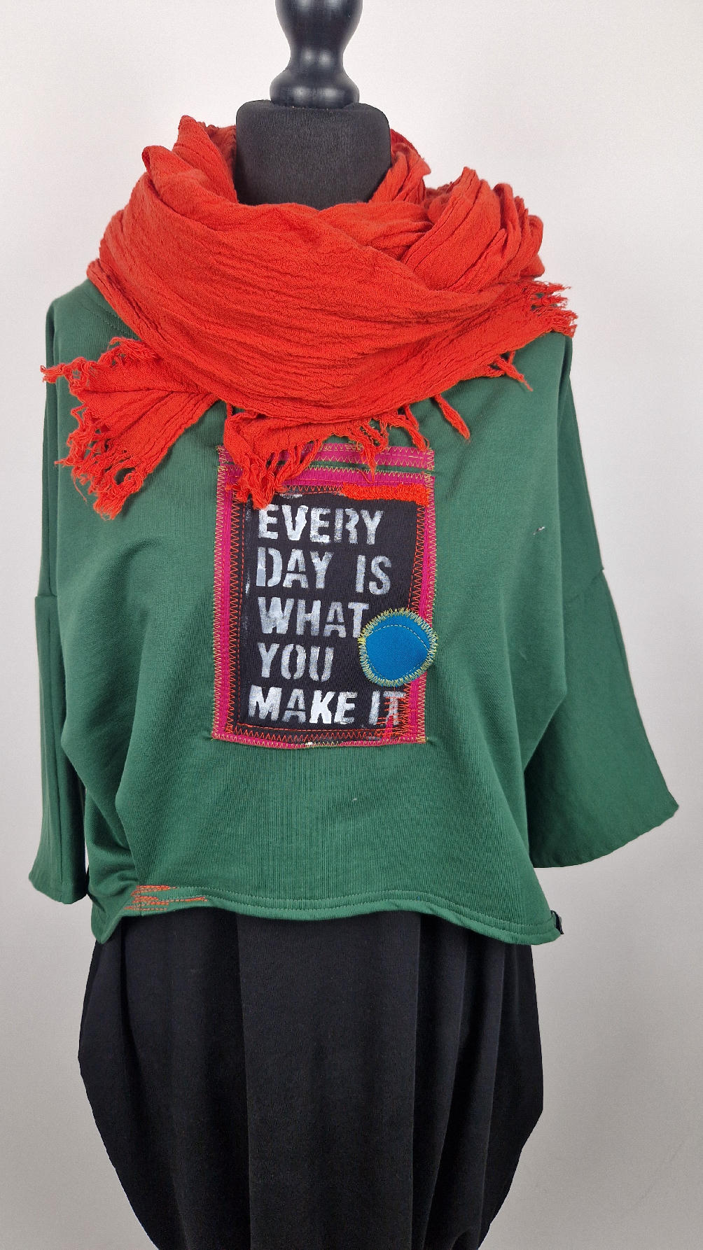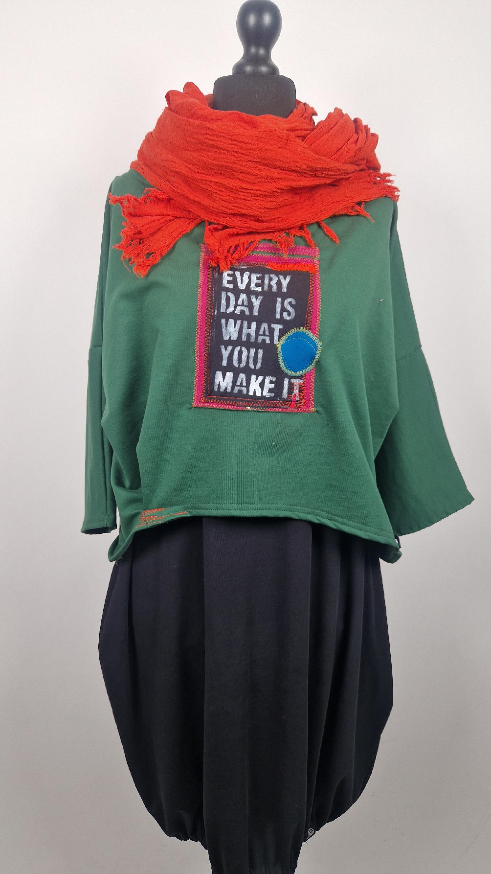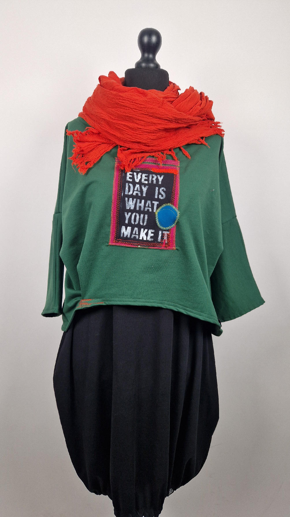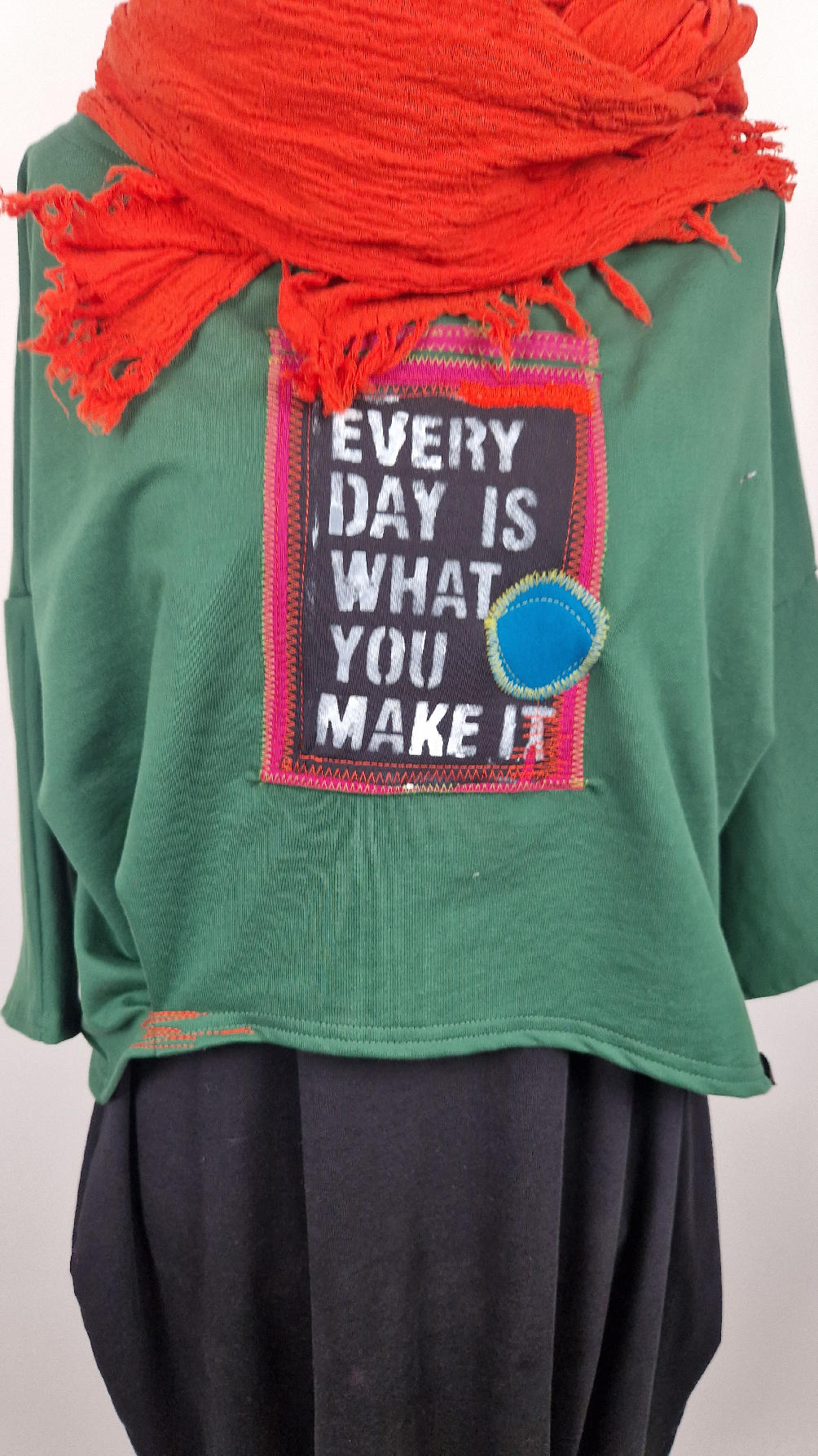 Krótka, zielona , taka liściasta bluzka z aplikacją z napisem, z kontrastowymi dodatkami. …Luźna w biuście bluzka typu NIETOPERZ, ale taki niewielki….bluzka uszyta z wysokiej jakości bawełny z pętelką, z rękawem 3/4… , lekko zebrana na dole, żeby układała się bardziej… prosta, bez kieszeni – tak specjalnie, żeby nic nie odstawało ale z dużym dekoltem typu ,,łódka”, który możesz opuścić na jedno ramię, lub nosić symetrycznie…możesz założyć do niej ZARĘKAWKI