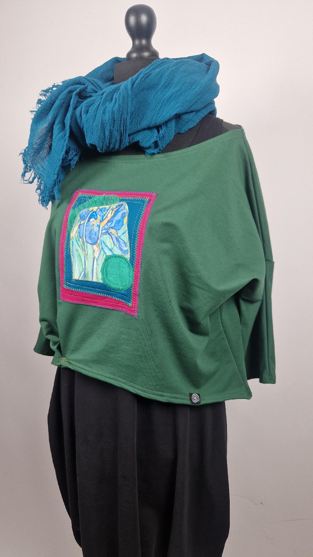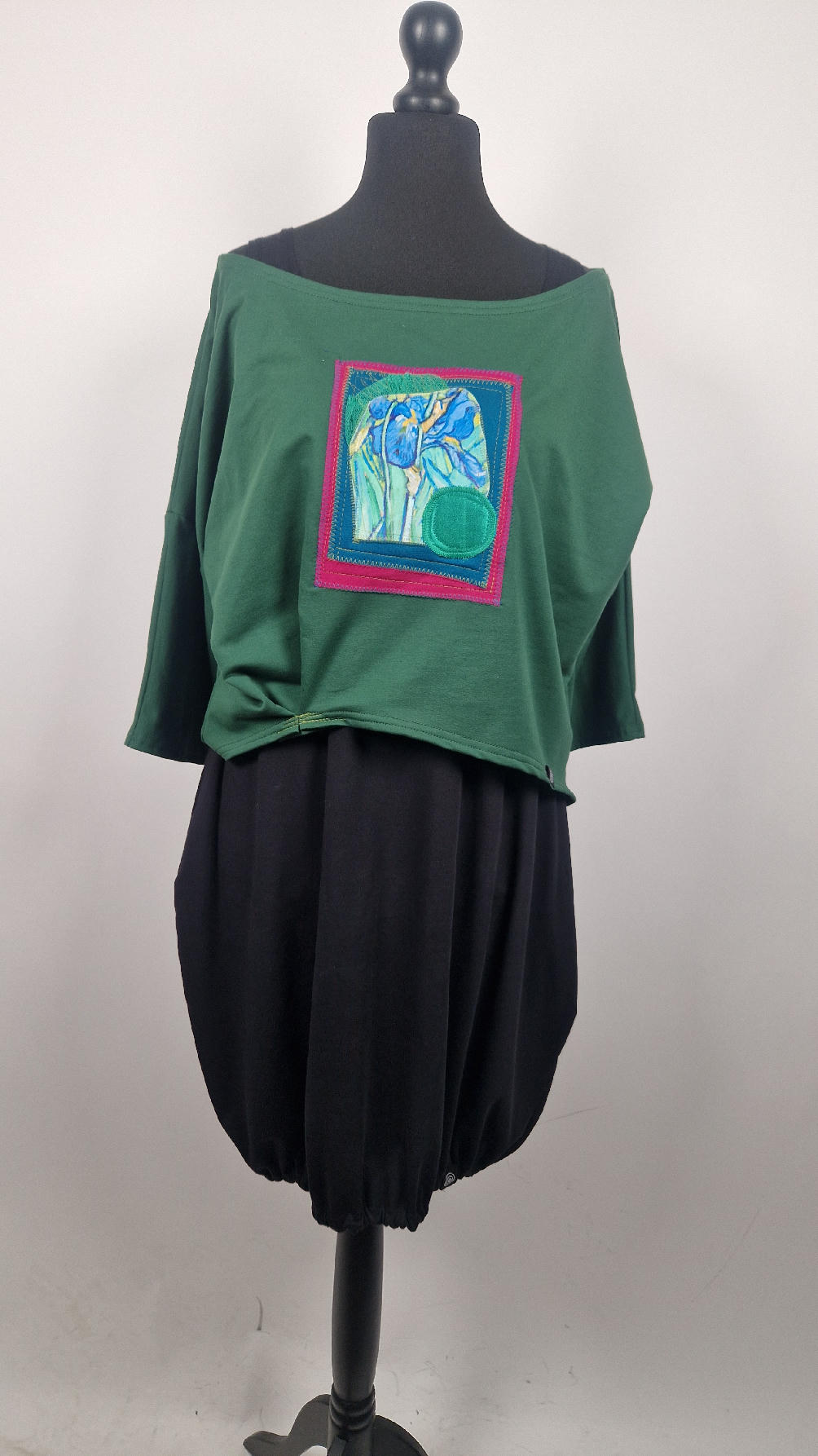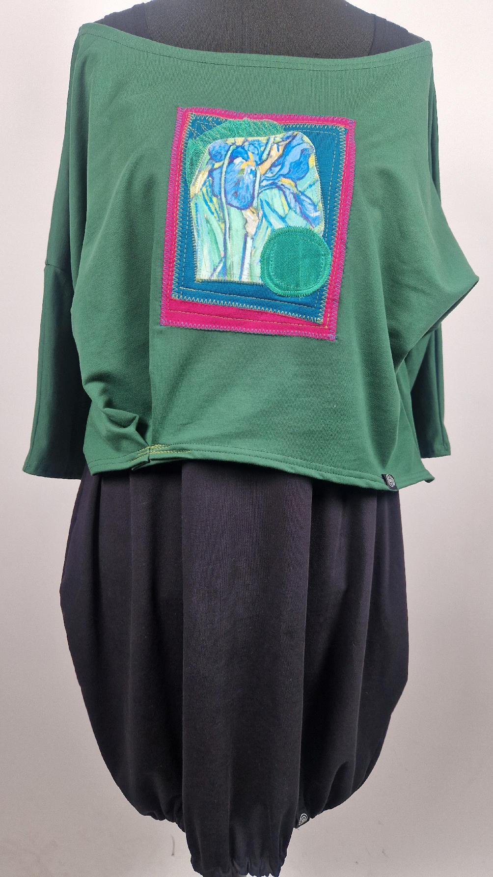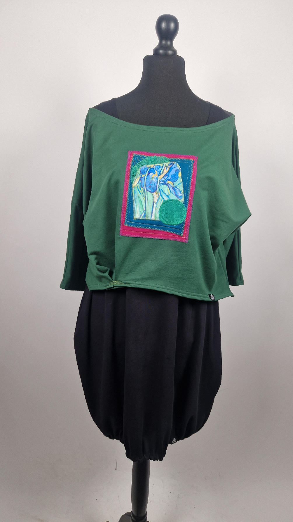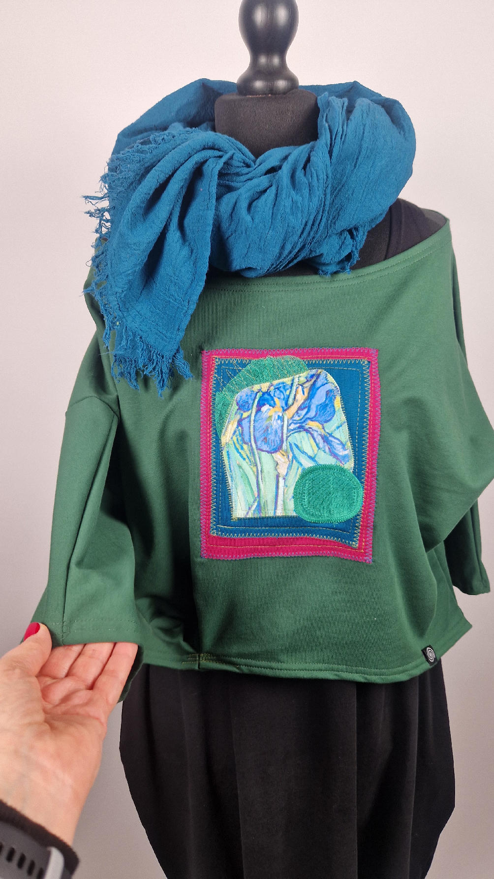 Krótka, zielona bluzka z aplikacją z Irysami z obrazu van Gogha , z kontrastowymi dodatkami. …Luźna w biuście bluzka typu NIETOPERZ, ale taki niewielki….bluzka uszyta z wysokiej jakości bawełny z pętelką, z rękawem 3/4… , lekko zebrana na dole, żeby układała się bardziej… prosta, bez kieszeni – tak specjalnie, żeby nic nie odstawało ale z dużym dekoltem typu ,,łódka”, który możesz opuścić na jedno ramię, lub nosić symetrycznie…możesz założyć do niej ZARĘKAWKI