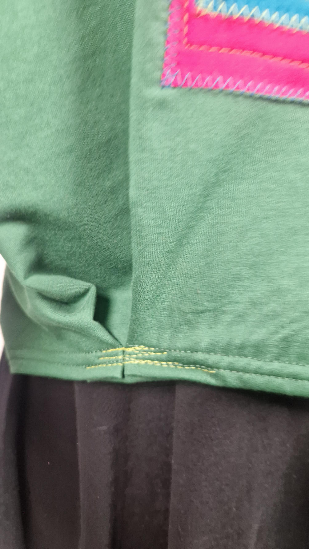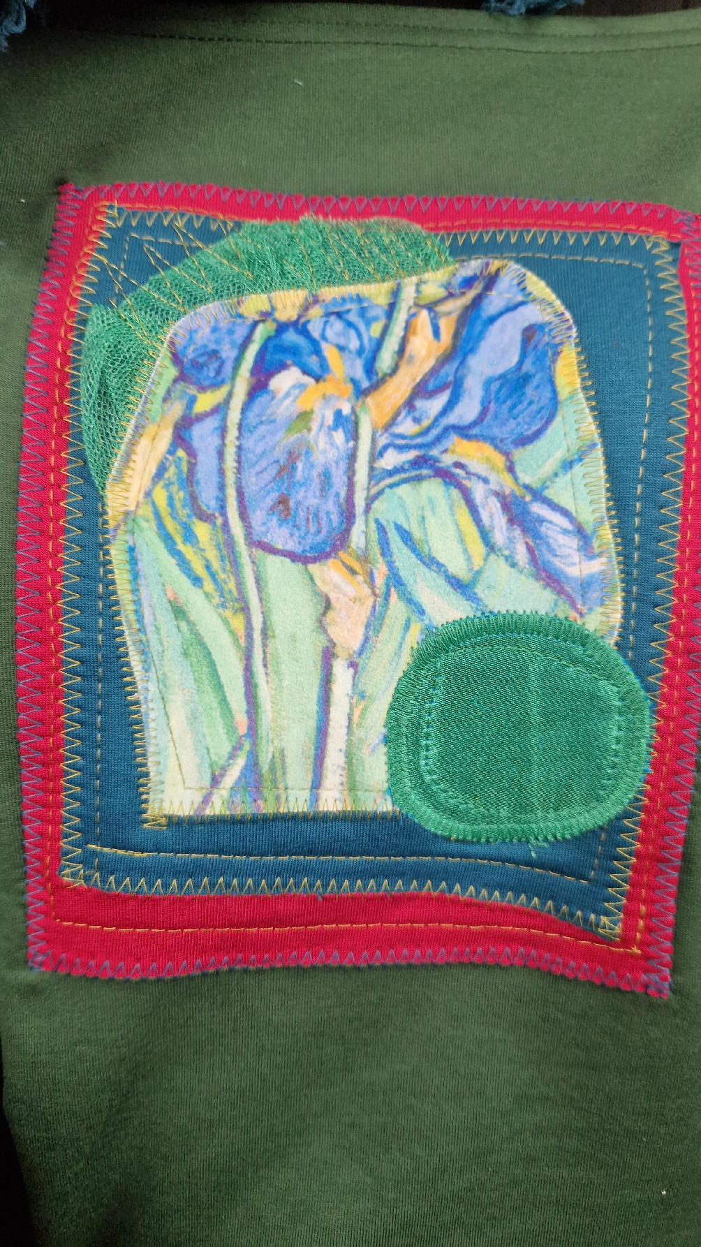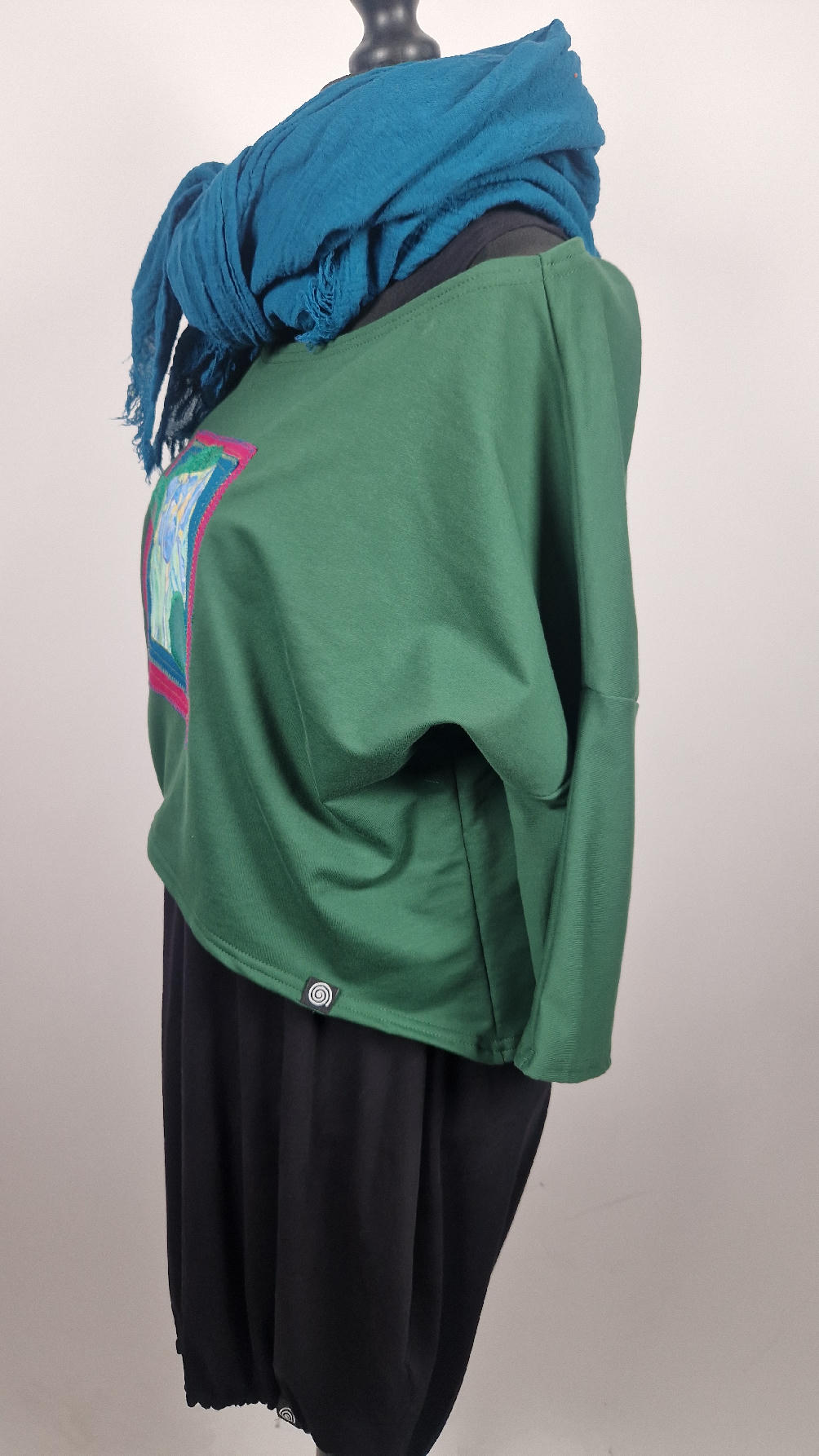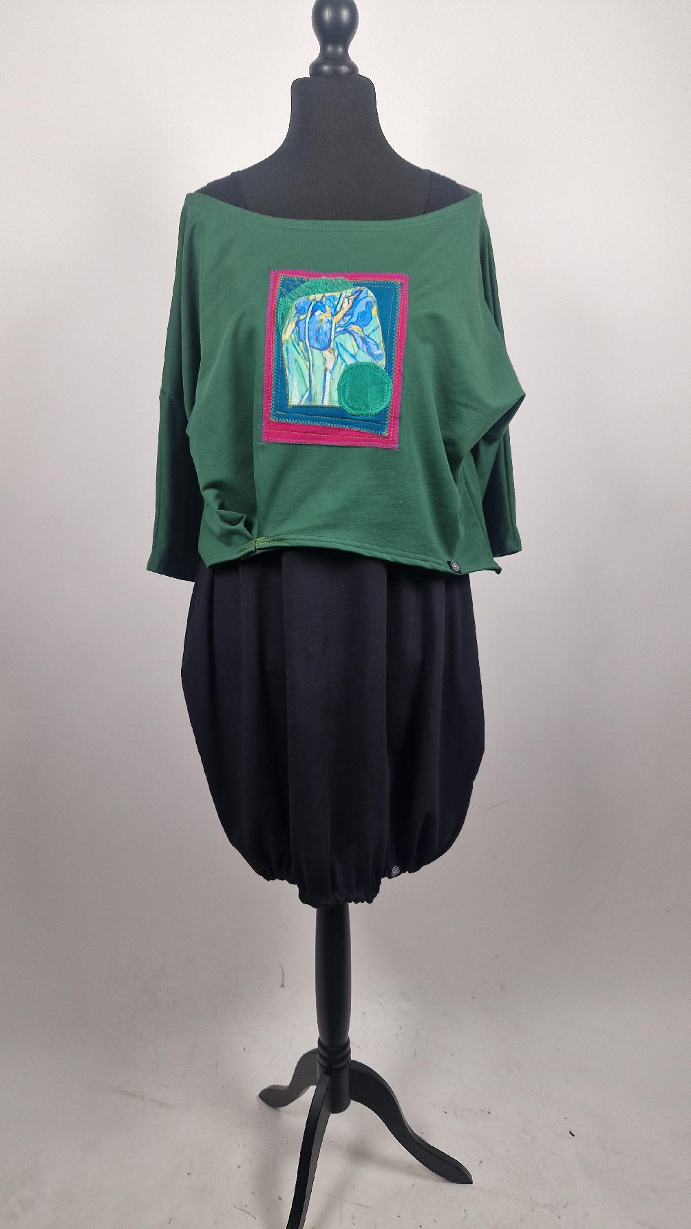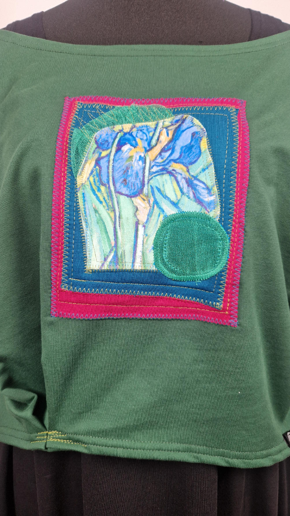 Krótka, zielona bluzka z aplikacją z Irysami z obrazu van Gogha , z kontrastowymi dodatkami. …Luźna w biuście bluzka typu NIETOPERZ, ale taki niewielki….bluzka uszyta z wysokiej jakości bawełny z pętelką, z rękawem 3/4… , lekko zebrana na dole, żeby układała się bardziej… prosta, bez kieszeni – tak specjalnie, żeby nic nie odstawało ale z dużym dekoltem typu ,,łódka”, który możesz opuścić na jedno ramię, lub nosić symetrycznie…możesz założyć do niej ZARĘKAWKI
