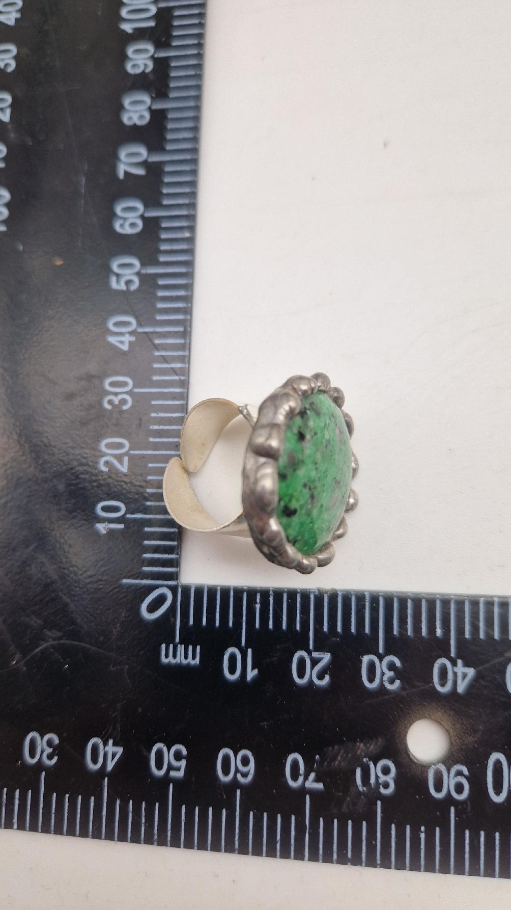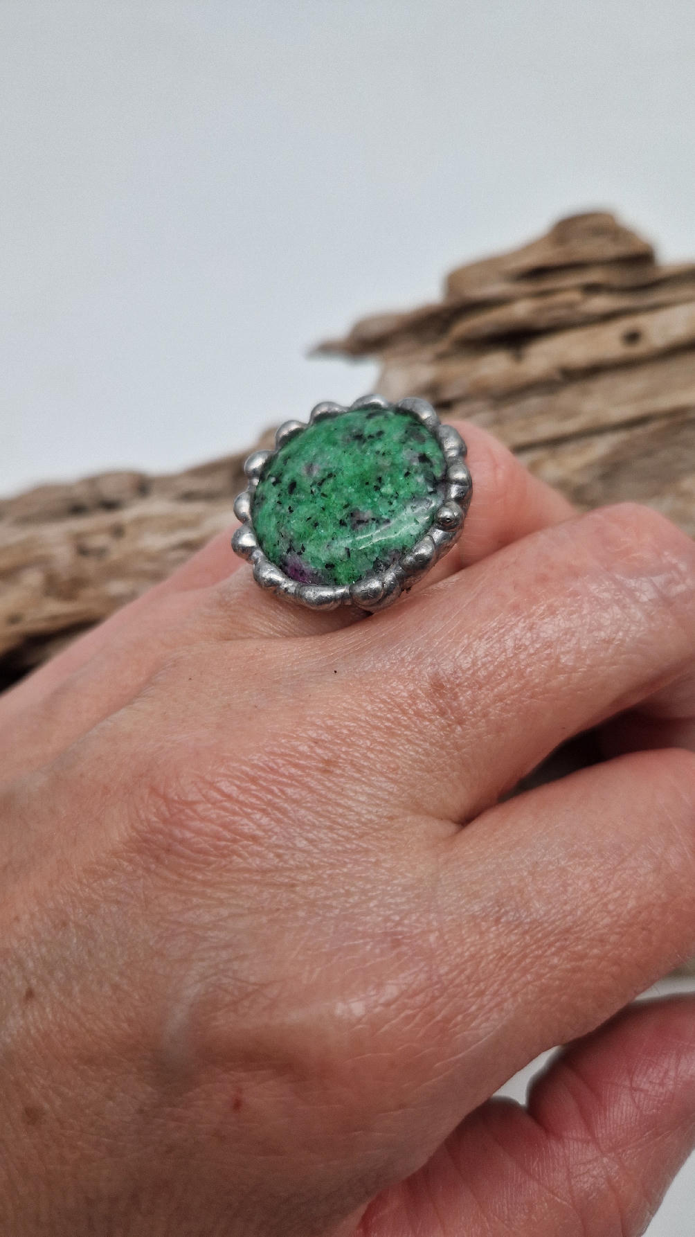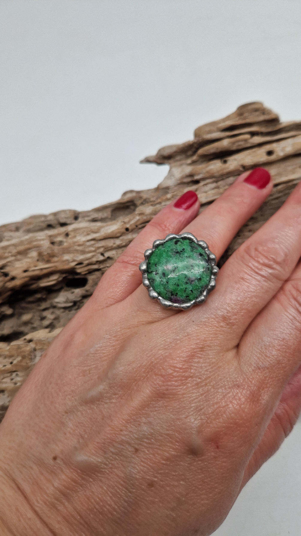 Megazielony, śliczny , okrągły pierścionek… a kamień, w środku to ZOIZYT Z RUBINEM z TANZANII spodobał mi się ten głęboki zielony kolor z różowymi plamkami…oprawiony w kutą i patynowaną miedź. Piękna metaloplastyka z pięknym kamieniem . Pierścionek ma regulowaną obrączkę, więc pasuje na każdy palec…ale możesz powiesić go na łańcuszku lub rzemieniu, jeśli nie lubisz pierścionków, a podoba Ci się forma i kamień…